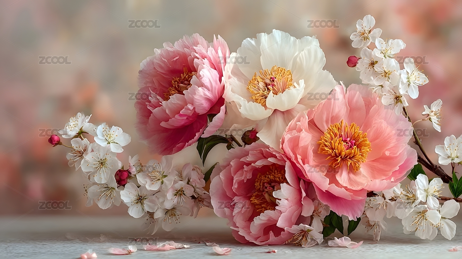 牡丹与樱花的花束特写