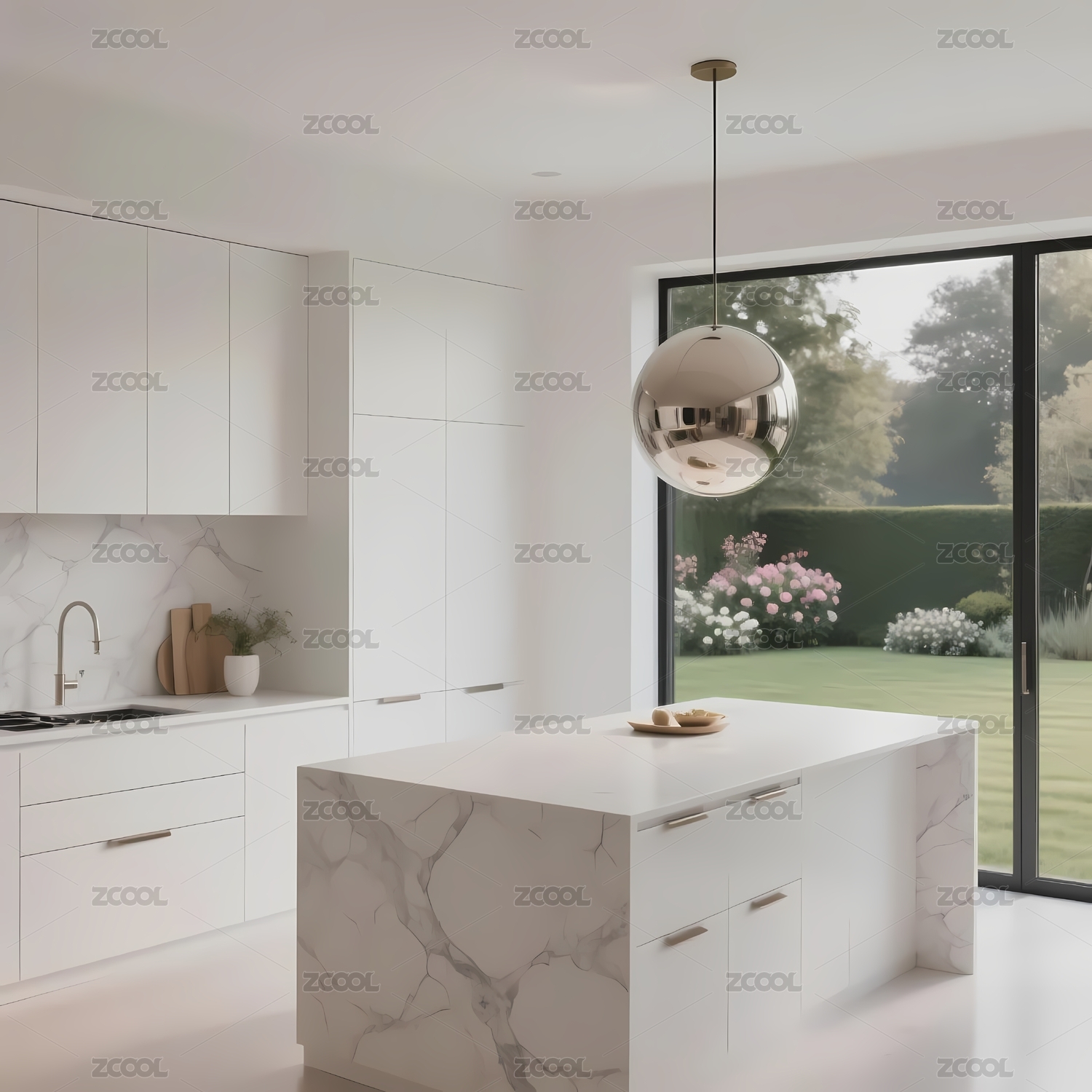 现代简约厨房大理石岛台与绿植景观