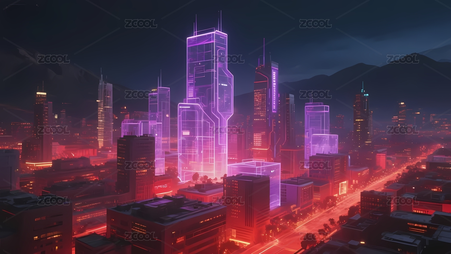 现代,未来,城市,夜景,高楼,霓虹,建筑,科技,都市,山峦