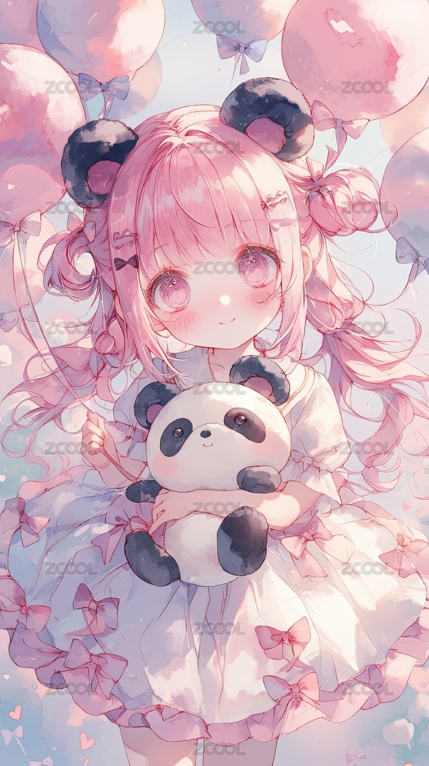 粉色少女怀抱熊猫玩偶背景飘满气球