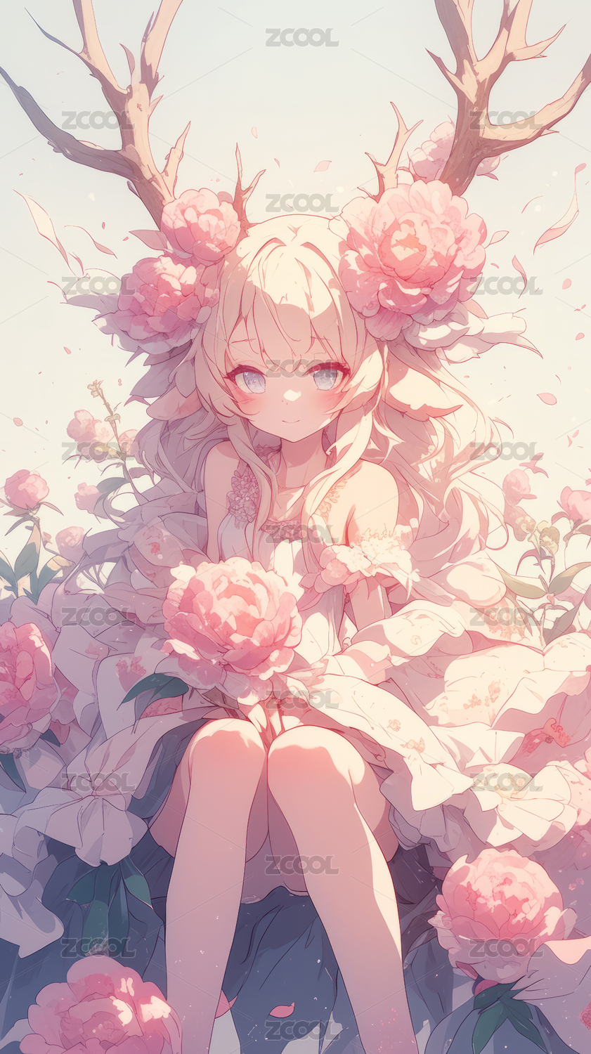 粉色少女怀抱猫咪花环点缀梦幻场景