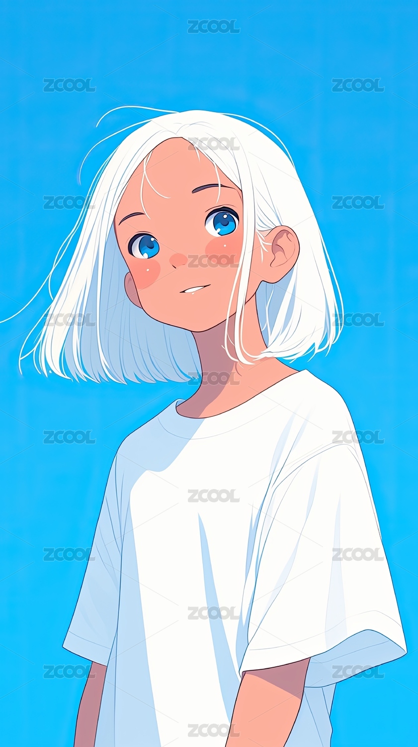 蓝发,女孩,微笑,眼睛,白色,头发,蓝色,背景,卡通,风格