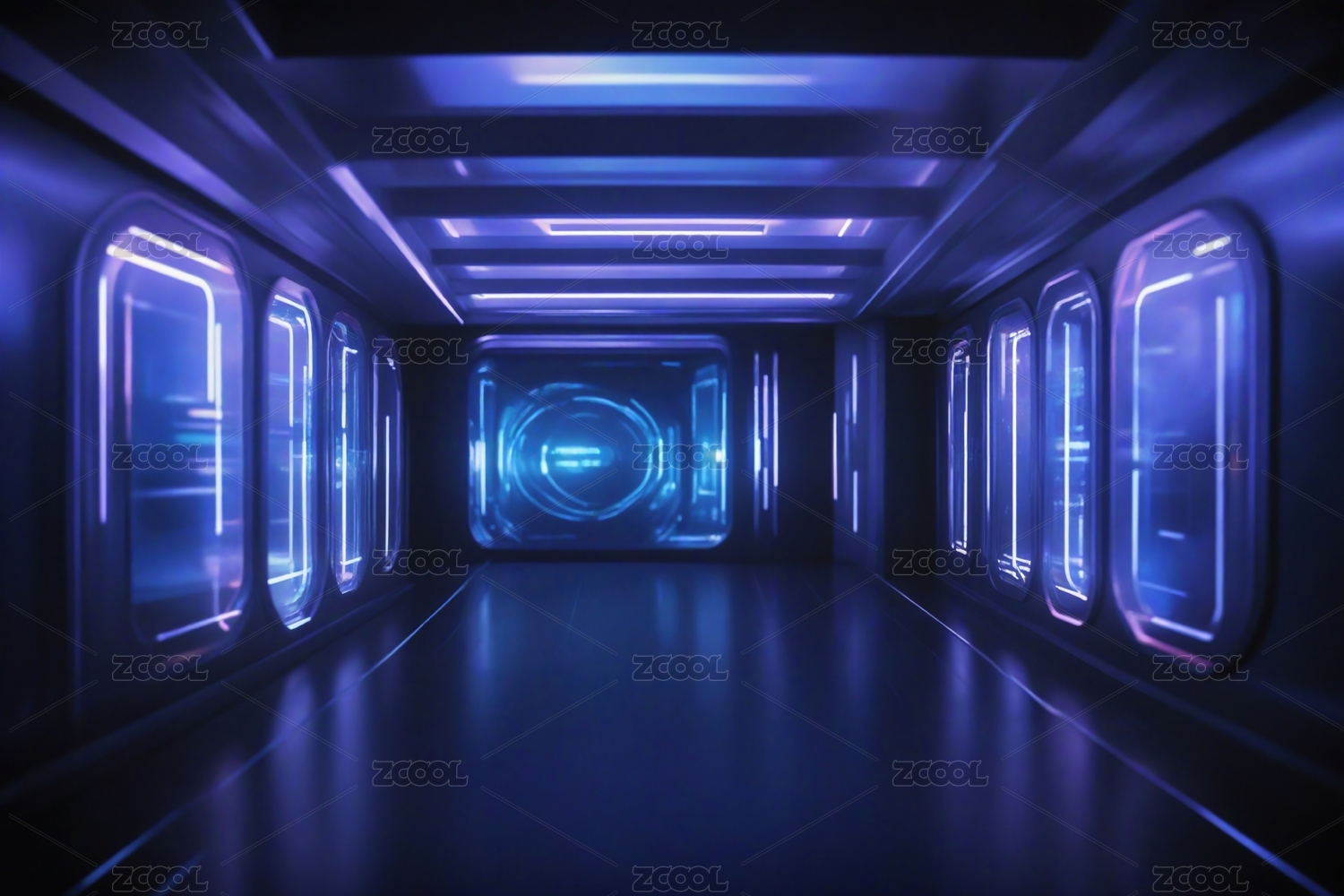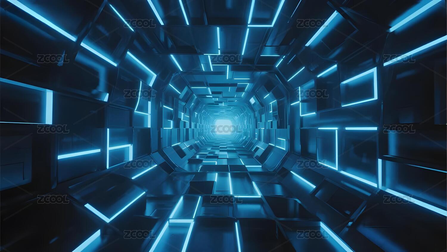 未来科技走廊蓝色霓虹灯照明