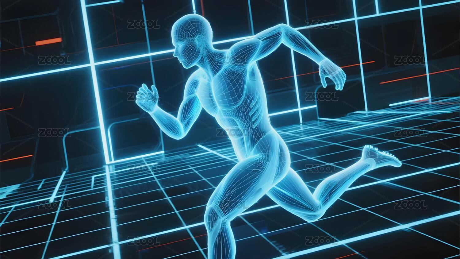 抽象运动员跑步的轮廓,深蓝色发光粒子背景