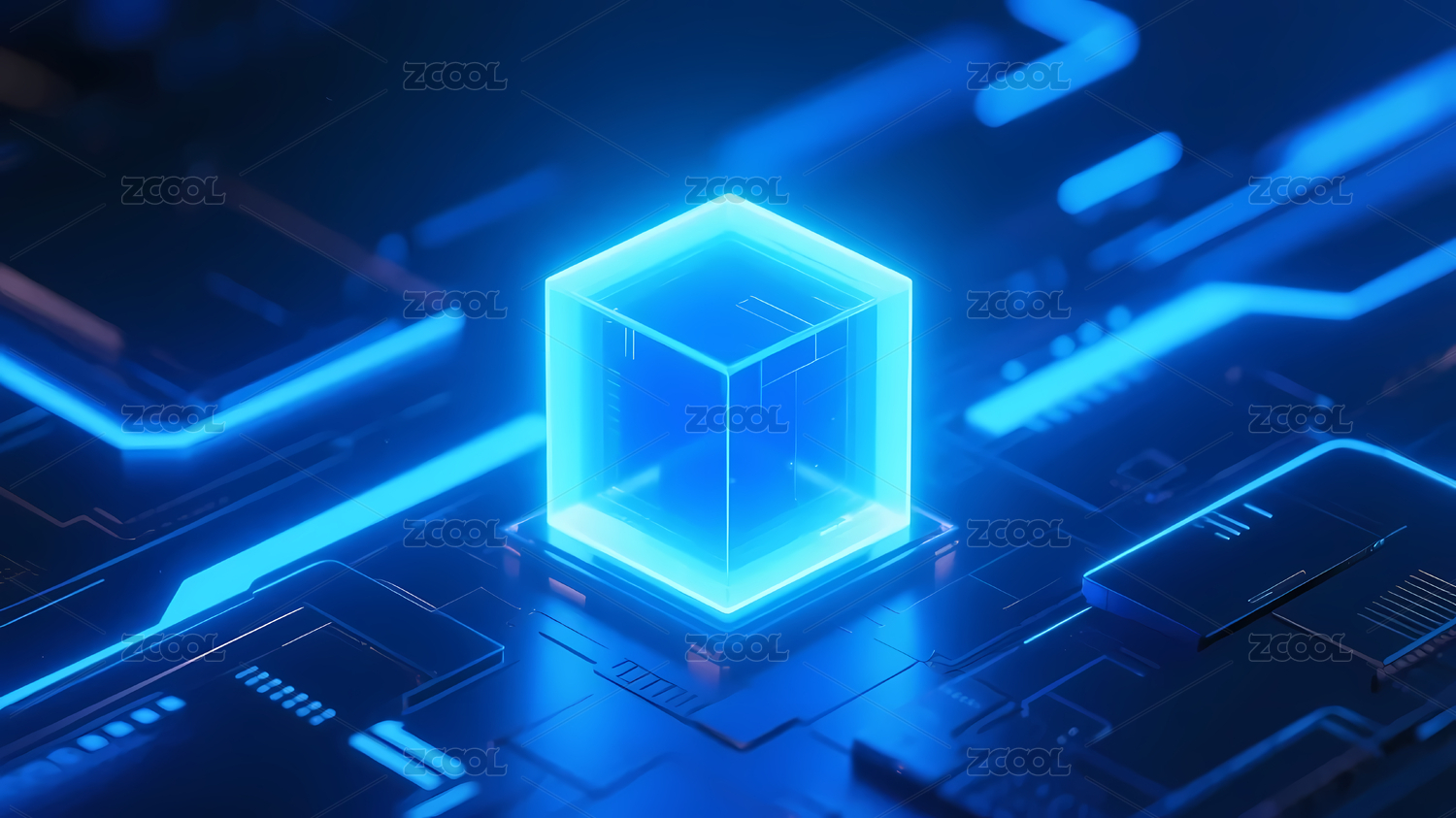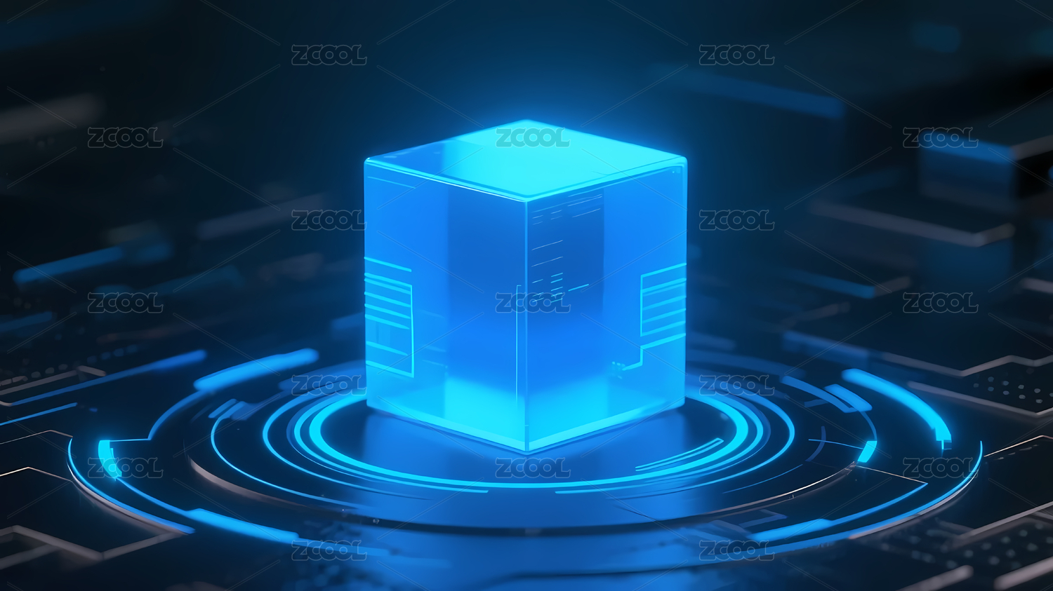 发光蓝色立方体与电路背景