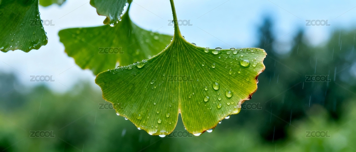 雨滴点缀绿色银杏叶片背景模糊金黄