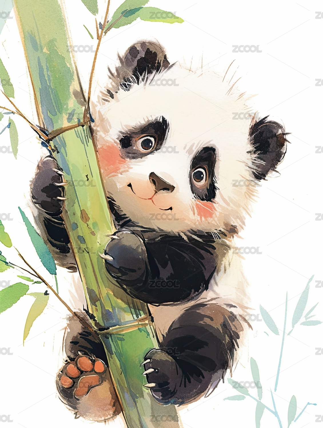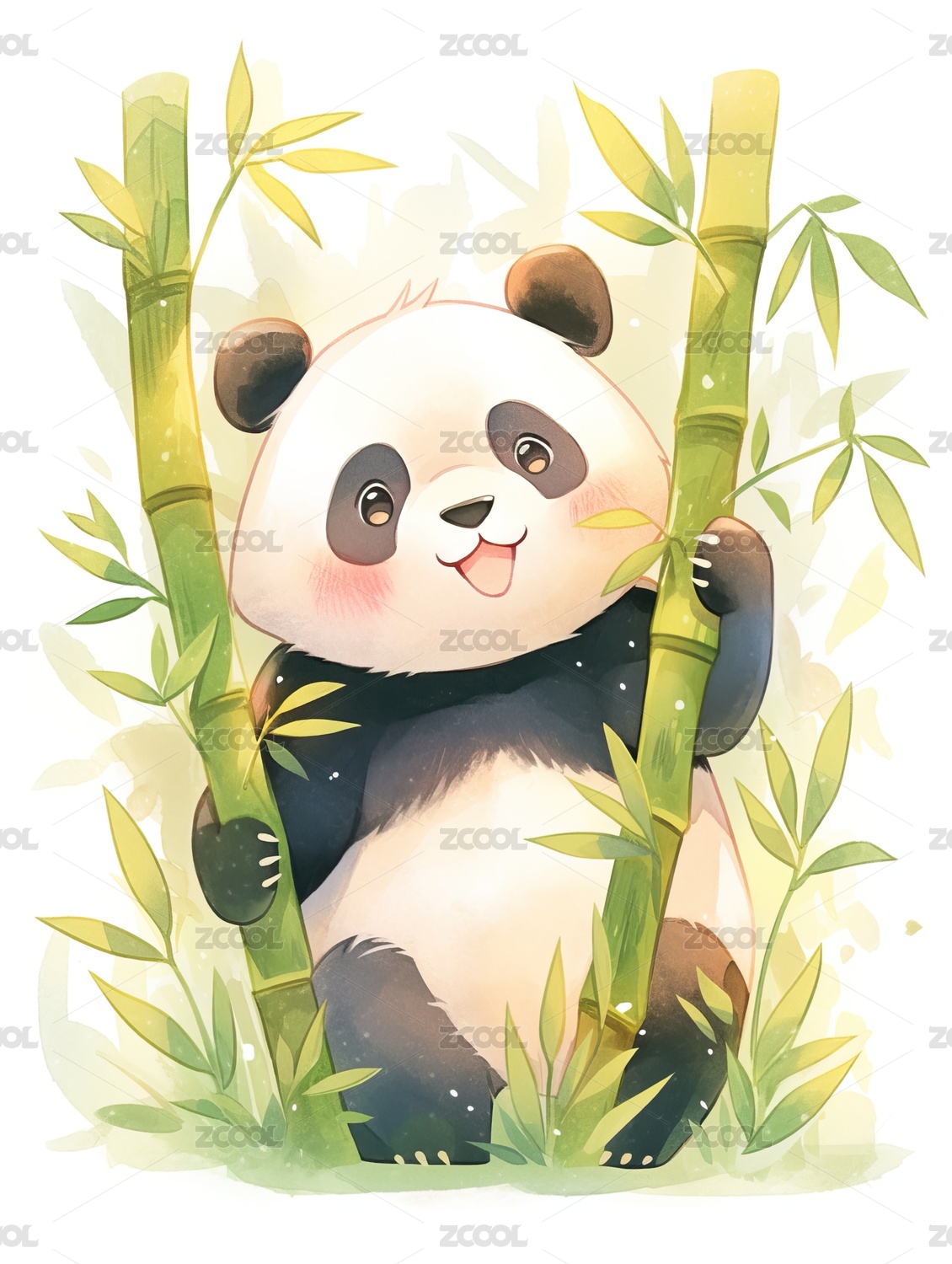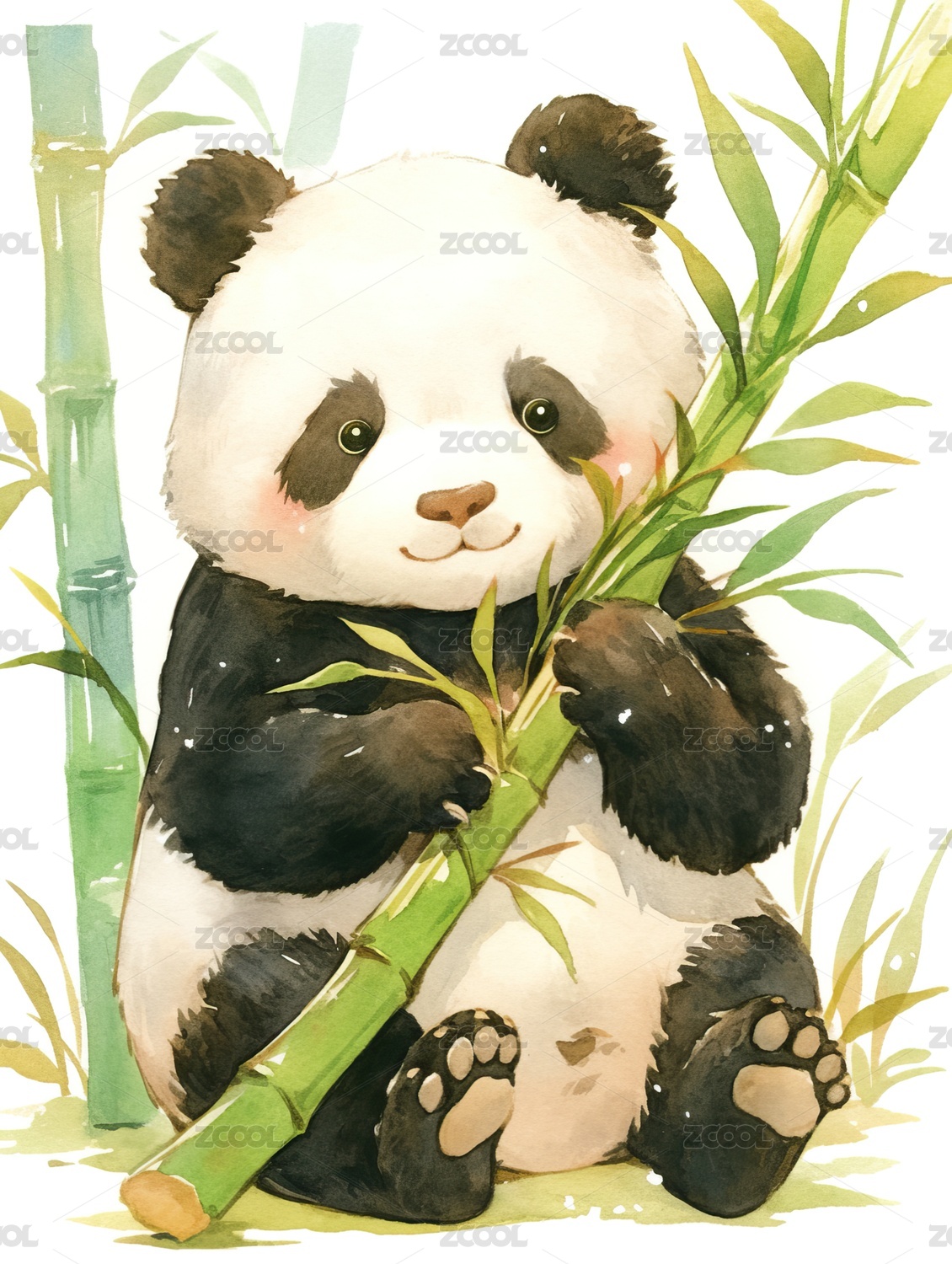 水彩风可爱熊猫抱着竹子方形插画