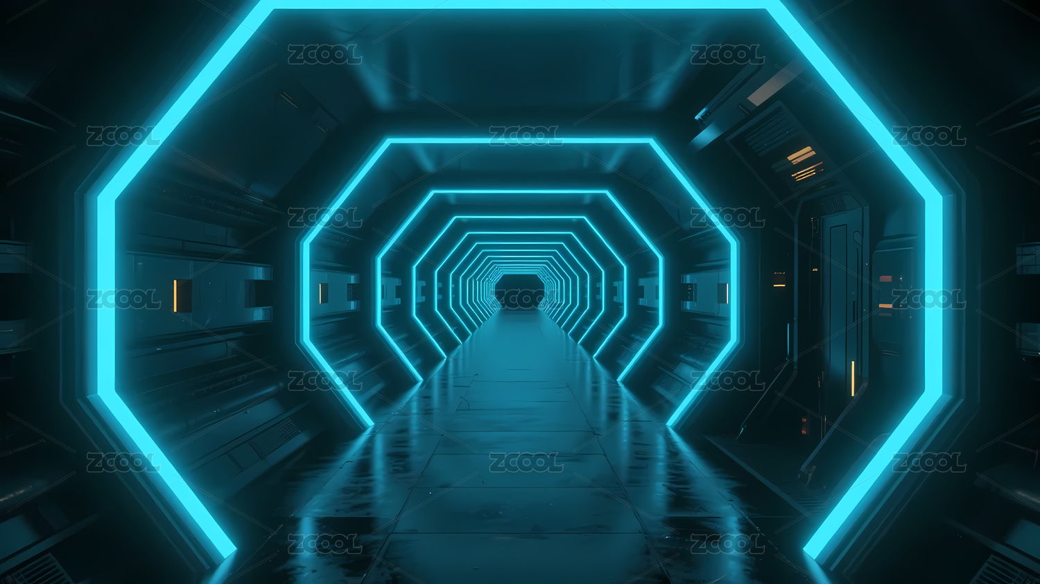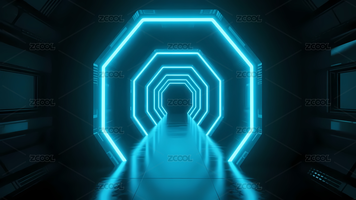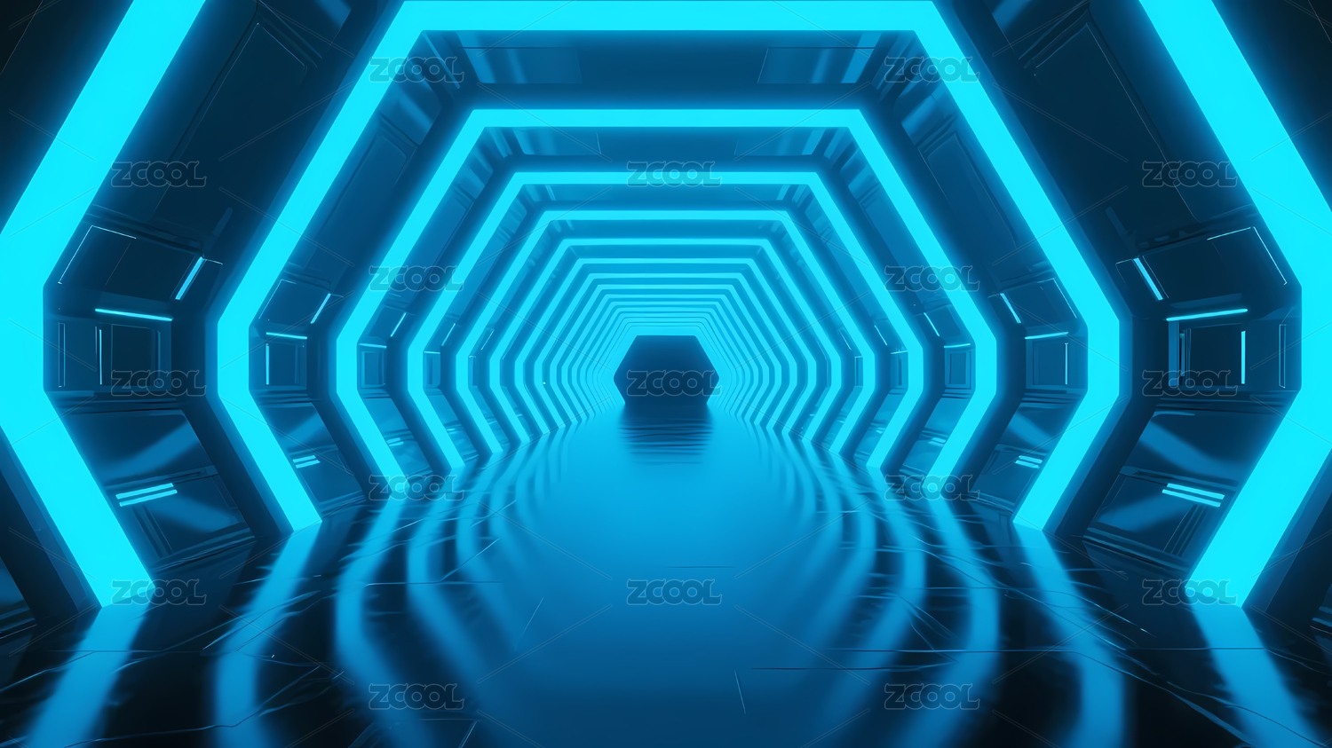 蓝色,科技,深邃,隧道,霓虹,框架,多边形,无限,未来感,空间感