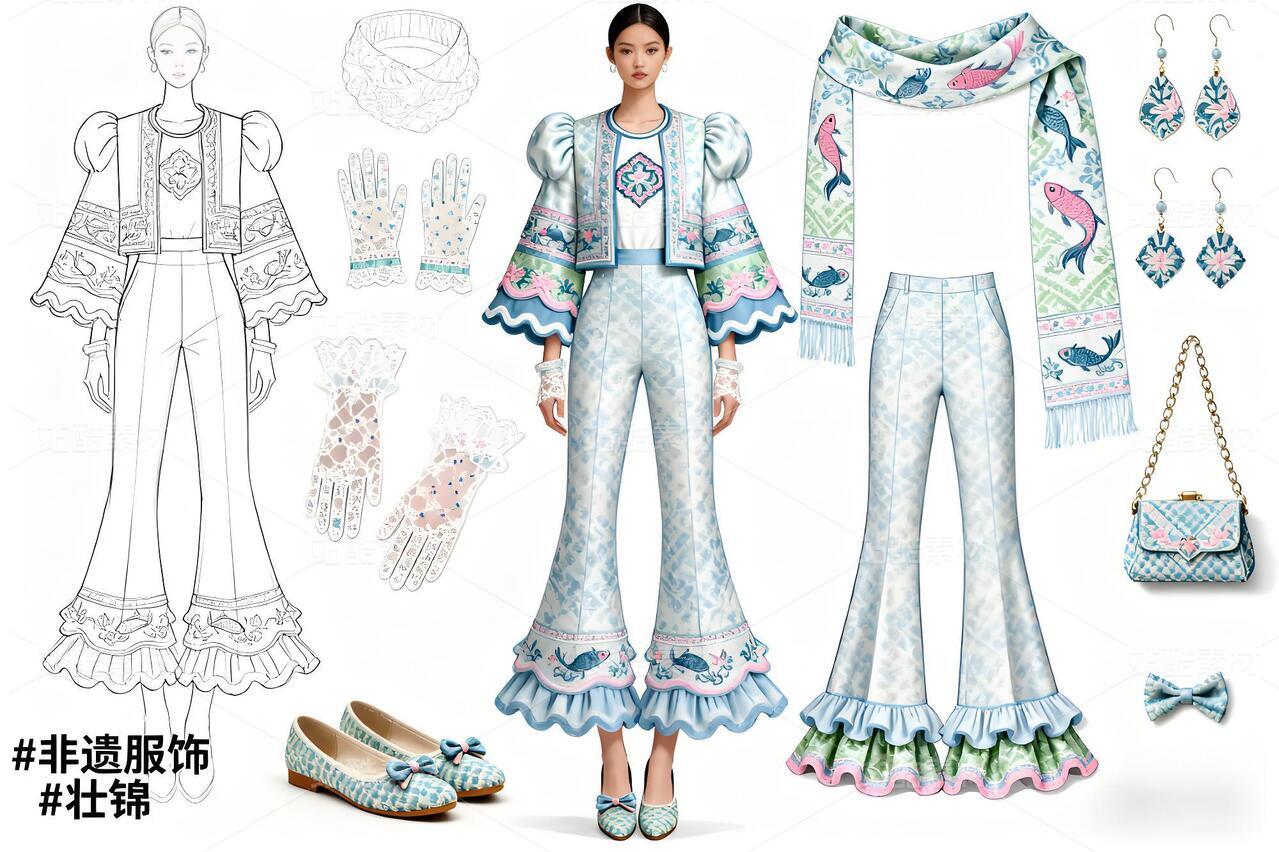 裤子:高腰阔腿裤,侧缝嵌壮锦纹带;