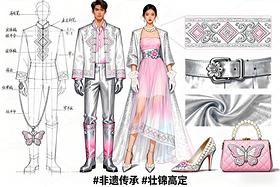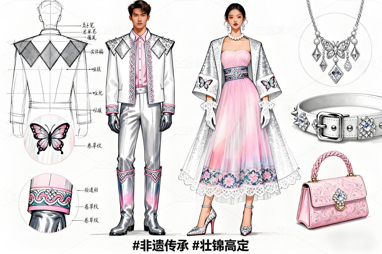 本系列以壮族壮锦为魂,银白象征高贵,浅粉添染浪漫。外套采用光泽缎面,壮锦以金线与浅粉丝线绣出云雷、万寿花纹,袖口与裤侧嵌传统织带。女性手套缀银铃,男性腰链挂粉晶银珠,步履间声光相随。设计突破民族服饰固有框架,将古老纹样置于未来感剪裁中——不是重复传统,而是让文化在穿戴中新生,向世界展示东方美学的无限可能。