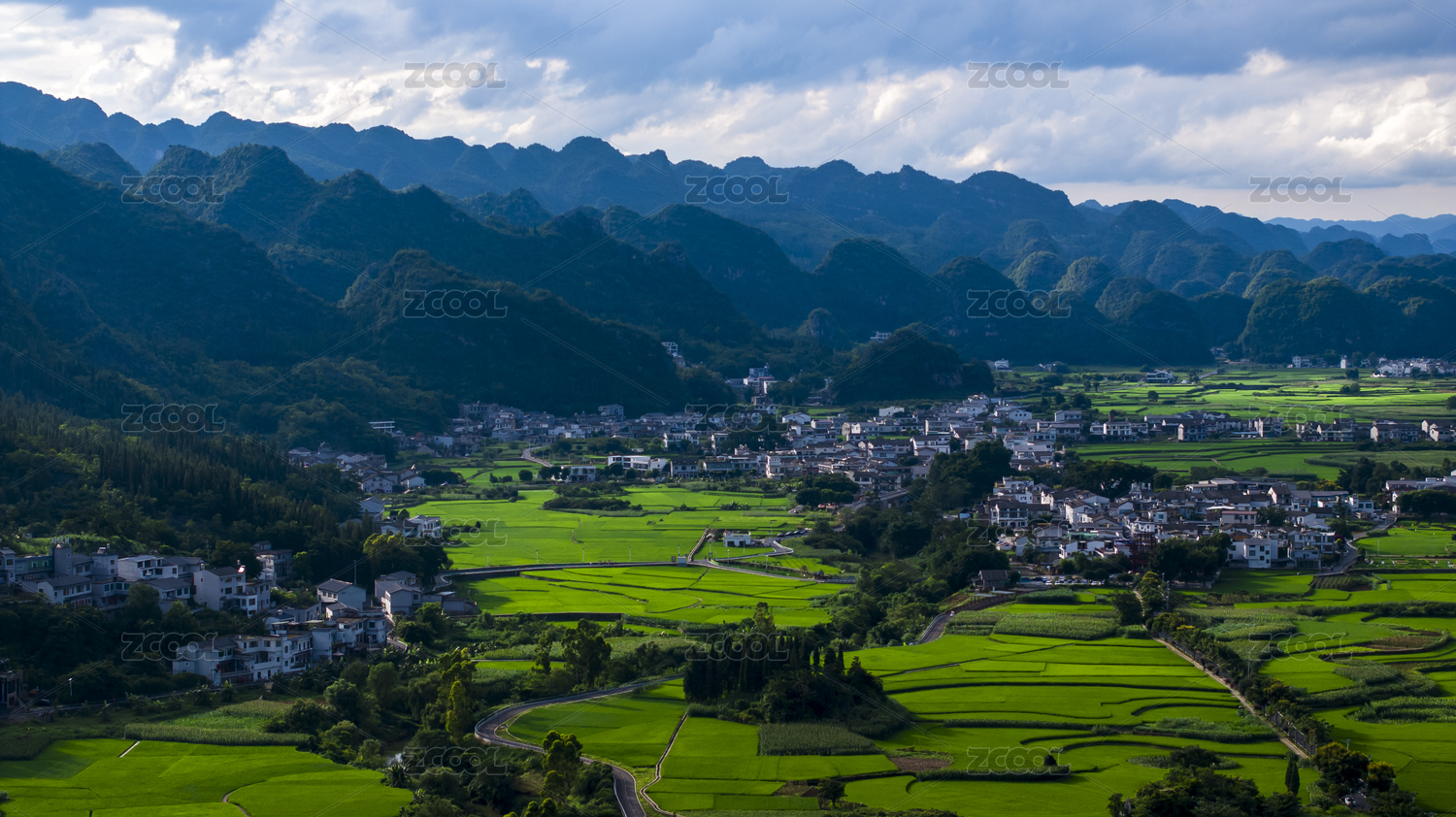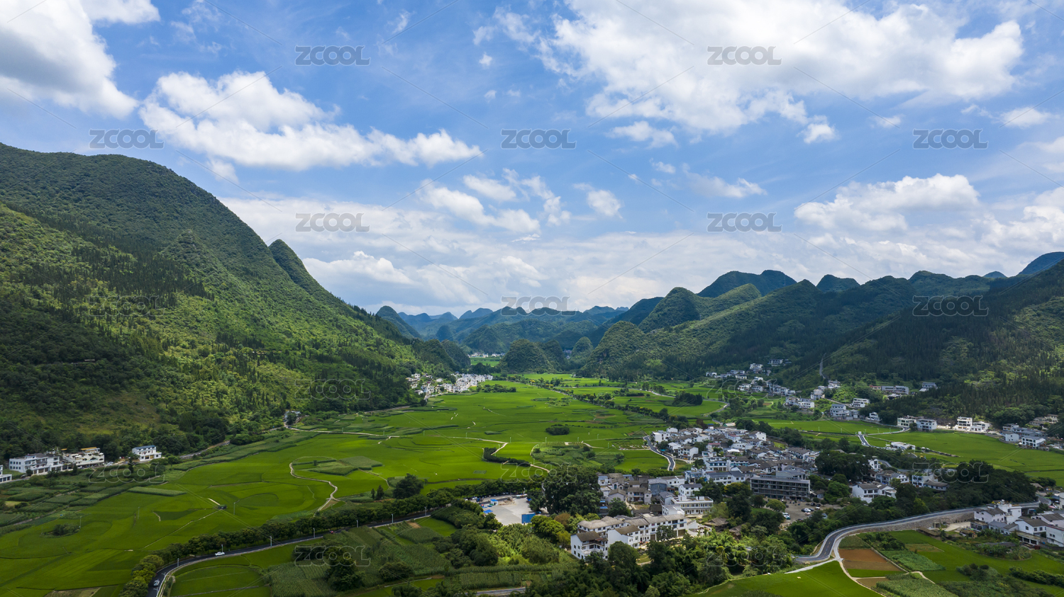 万峰林,田园风光,稻田,村庄,民居,蓝天白云,阳光明媚,山峰,喀斯特地貌