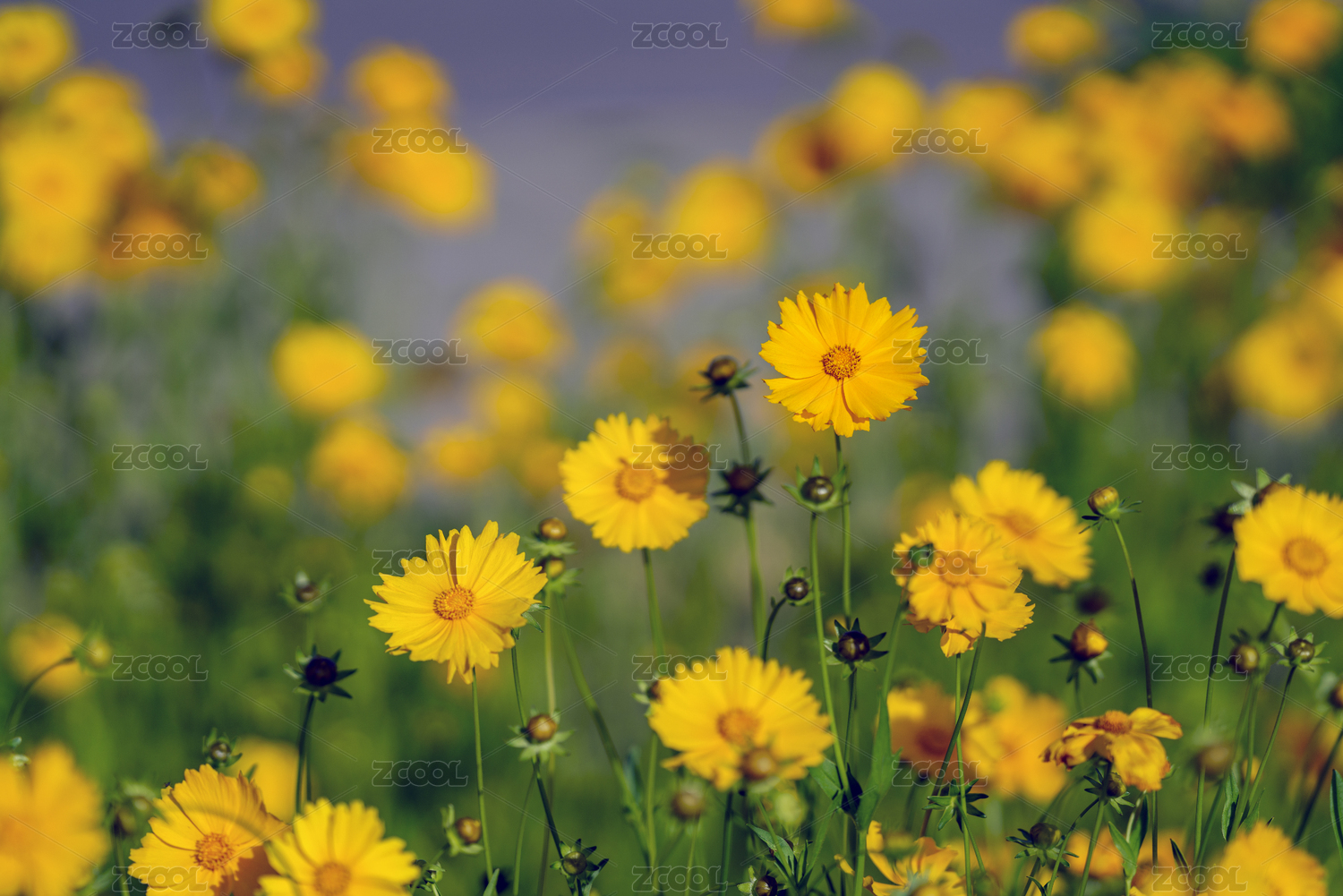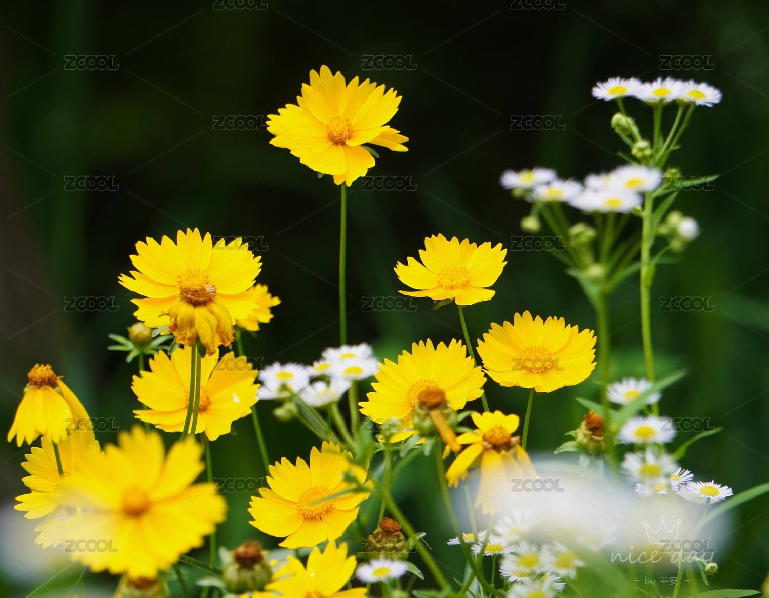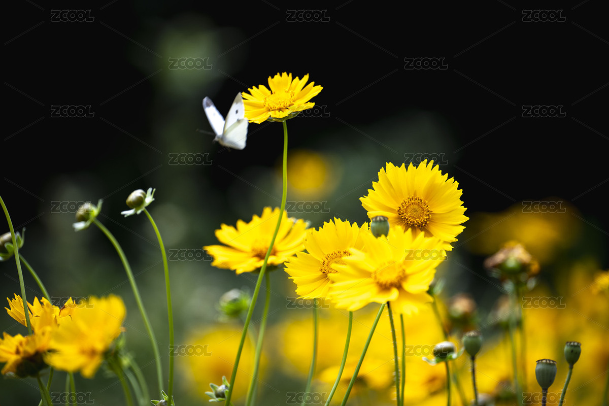 黄色的花丛中一只白色的蝴蝶正在采花蜜