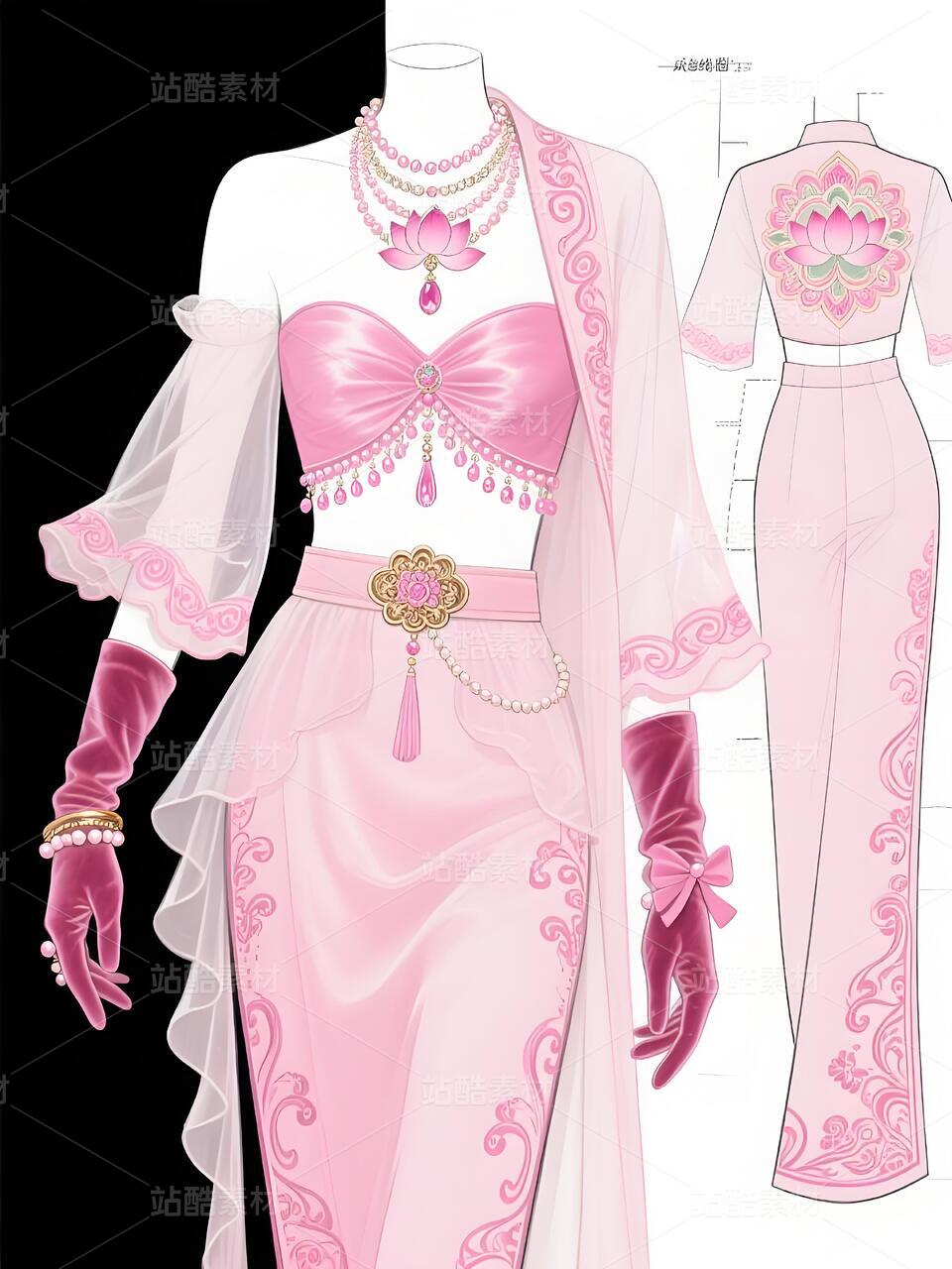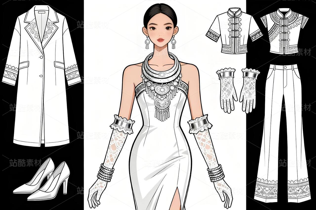 本案以“墨韵霓裳”为主题,融合中式美学与轻奢理念。裙身采用真丝绡与苏罗叠裁,呈现朦胧层次感;衣领处创新运用不对称盘扣设计,缀以手工刺绣云纹,延续古典韵味的同时突破传统格局。腰间饰有翡翠镂空环佩,与流苏耳饰呼应,凸显东方雅致。裙摆采用不对称剪裁,内衬暗纹提花缎面,行走间宛如水墨氤氲。手套与高跟鞋延续相同纹样,以金丝滚边勾勒整体轮廓。男装搭配同系列刺绣长袍,通过材质对比强调现代感,实现男女装元素的跨性别对话。此设计既传承了东方工匠精神,又以解构手法重塑当代轻奢定义。