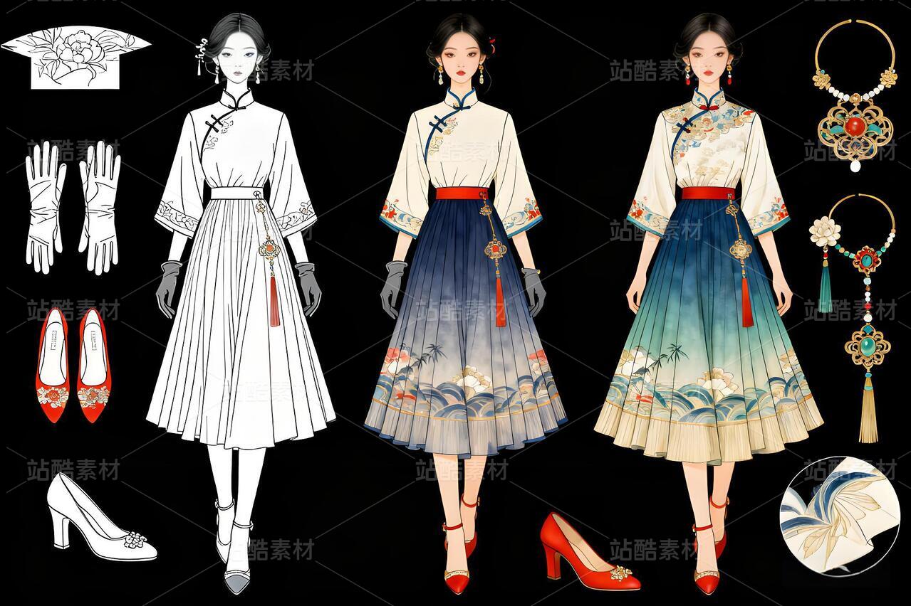 本案以“墨韵霓裳”为主题,融合中式美学与轻奢理念。裙身采用真丝绡与苏罗叠裁,呈现朦胧层次感;衣领处创新运用不对称盘扣设计,缀以手工刺绣云纹,延续古典韵味的同时突破传统格局。腰间饰有翡翠镂空环佩,与流苏耳饰呼应,凸显东方雅致。裙摆采用不对称剪裁,内衬暗纹提花缎面,行走间宛如水墨氤氲。手套与高跟鞋延续相同纹样,以金丝滚边勾勒整体轮廓。男装搭配同系列刺绣长袍,通过材质对比强调现代感,实现男女装元素的跨性别对话。此设计既传承了东方工匠精神,又以解构手法重塑当代轻奢定义。