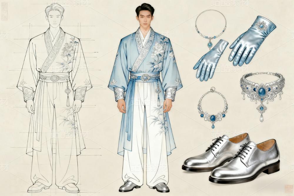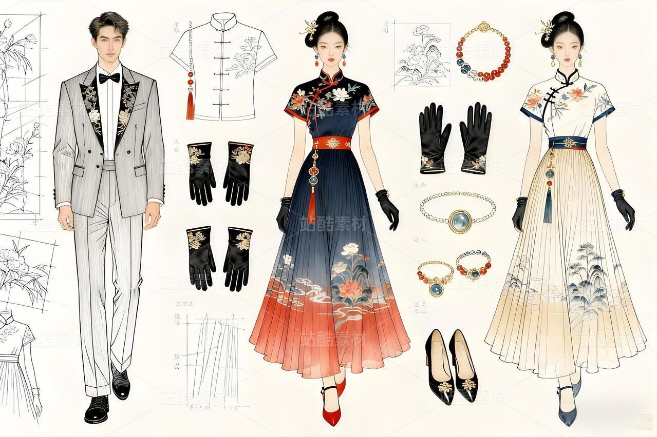 本案以“墨韵霓裳”为主题,融合中式美学与轻奢理念。裙身采用真丝绡与苏罗叠裁,呈现朦胧层次感;衣领处创新运用不对称盘扣设计,缀以手工刺绣云纹,延续古典韵味的同时突破传统格局。腰间饰有翡翠镂空环佩,与流苏耳饰呼应,凸显东方雅致。裙摆采用不对称剪裁,内衬暗纹提花缎面,行走间宛如水墨氤氲。手套与高跟鞋延续相同纹样,以金丝滚边勾勒整体轮廓。男装搭配同系列刺绣长袍,通过材质对比强调现代感,实现男女装元素的跨性别对话。此设计既传承了东方工匠精神,又以解构手法重塑当代轻奢定义。