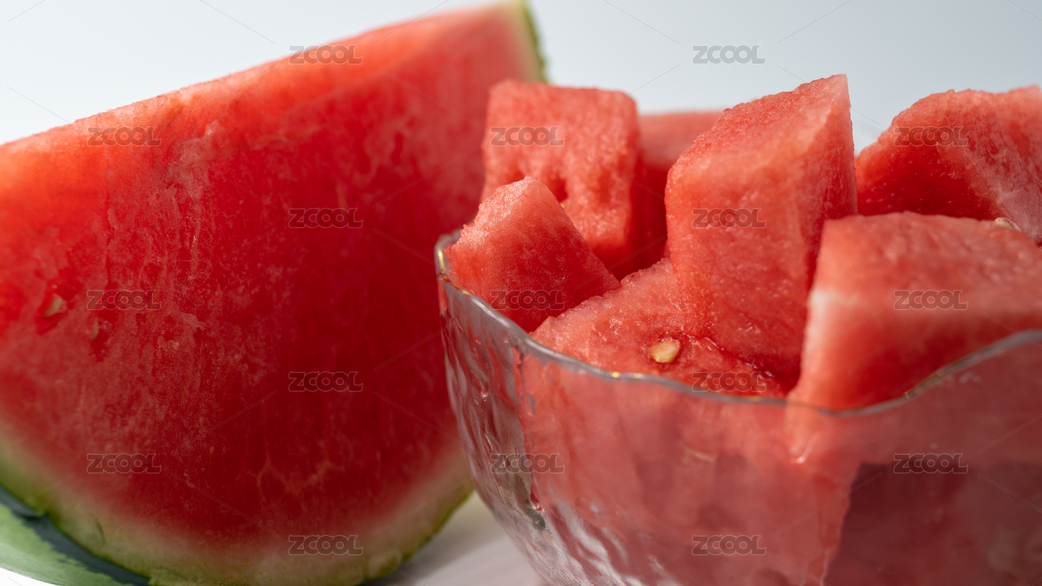 青底上摆放的切成三角块的西瓜瓜囊特写