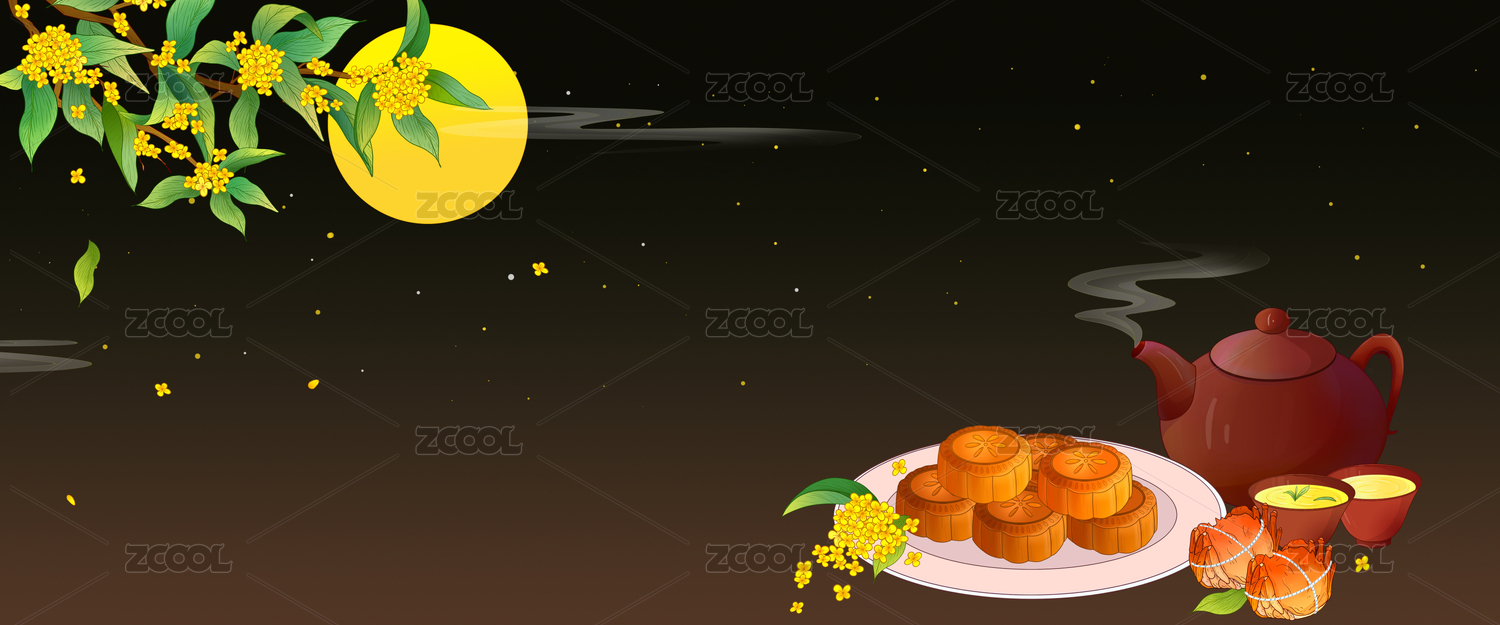 中秋节海报卡通插画桌上放着月饼茶具柿子