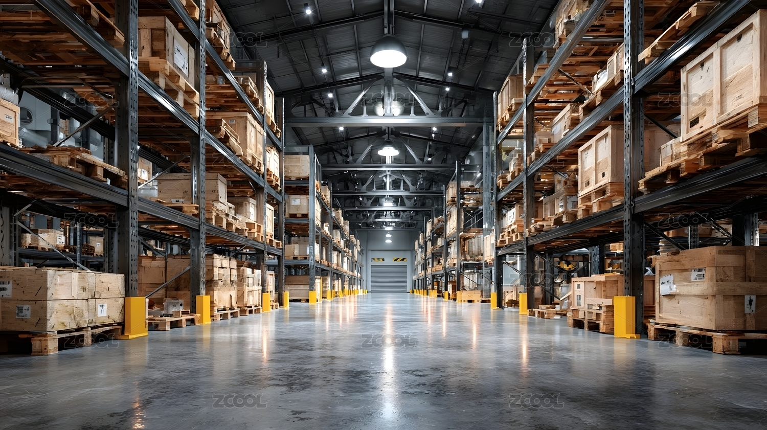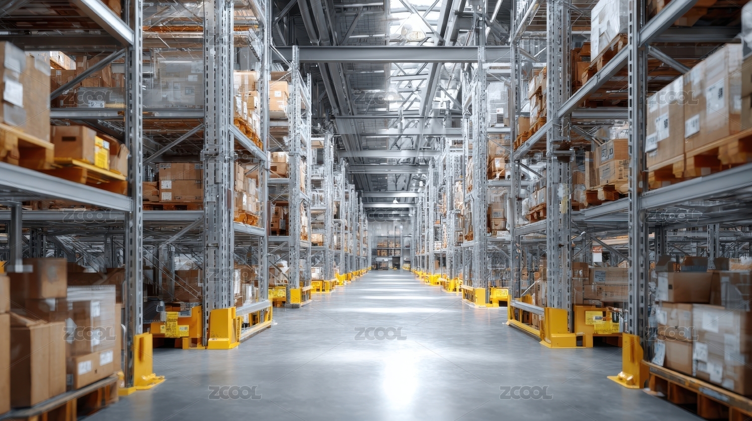 空间,仓库,货架,叉车,纸箱,托盘,灯光,地面,金属架,通道