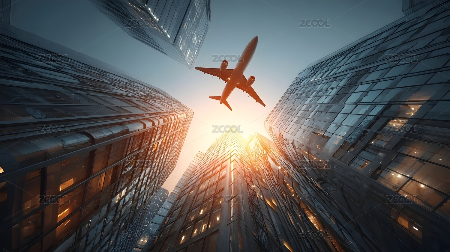 飞机飞过商业中心建筑物,低角度构图摄影。三维渲染图。