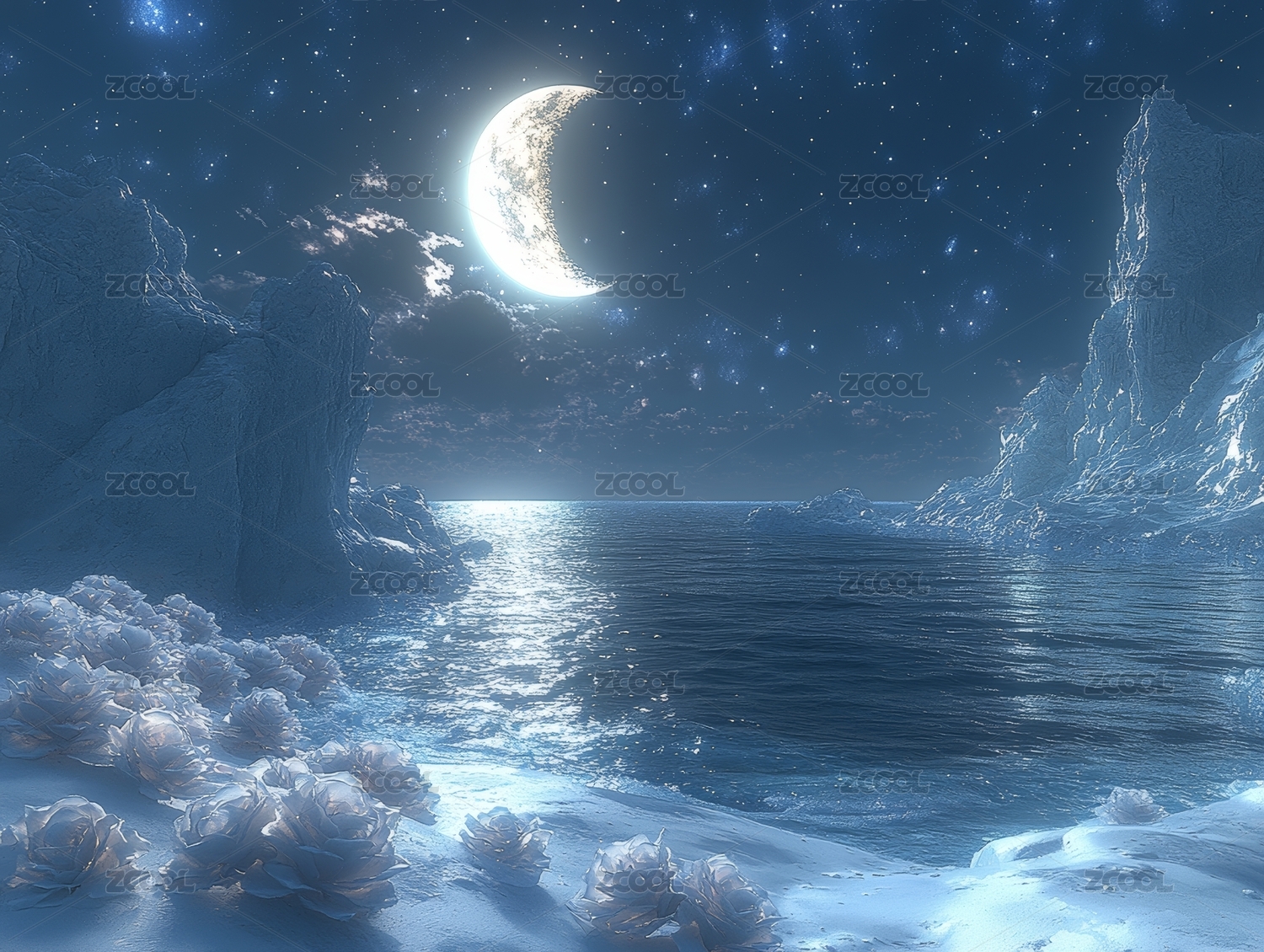 夜空下的海洋与新月