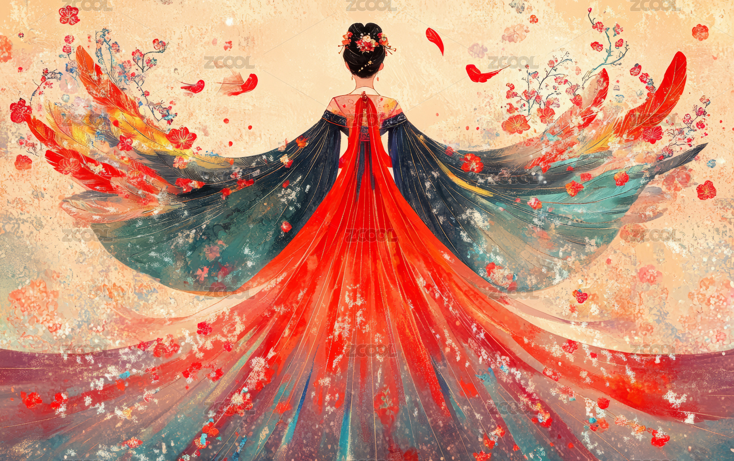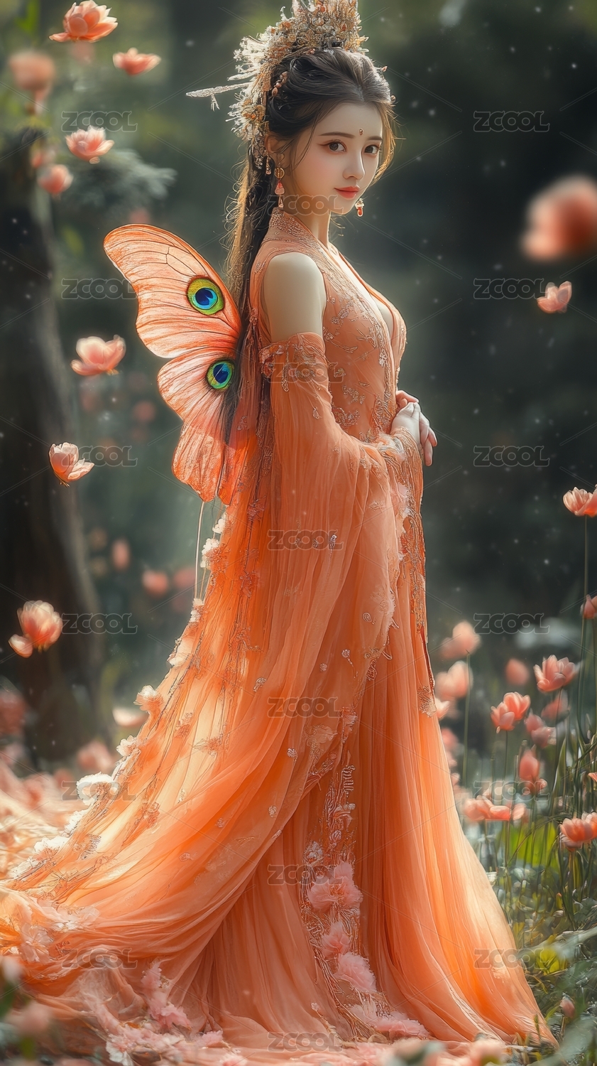 华丽橙色礼服与孔雀羽毛的梦幻场景