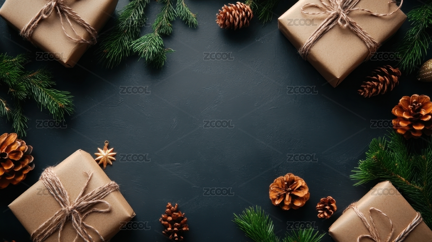 礼物盒,节日氛围,节日装饰,圣诞礼物,松枝装饰,红色丝带,松果点缀,绿色背景,礼品包装,冬季元素