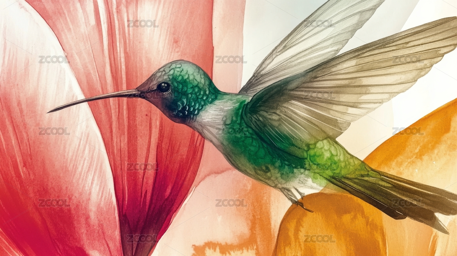 翠绿蜂鸟停驻于鲜艳花瓣旁