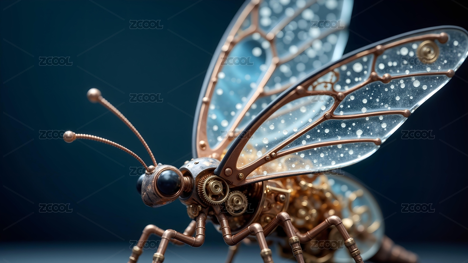 透明翅膀,创意设计,昆虫造型,青花瓷,机械蜂,融合艺术,金属质感,复杂结构,精细纹理,自然元素
