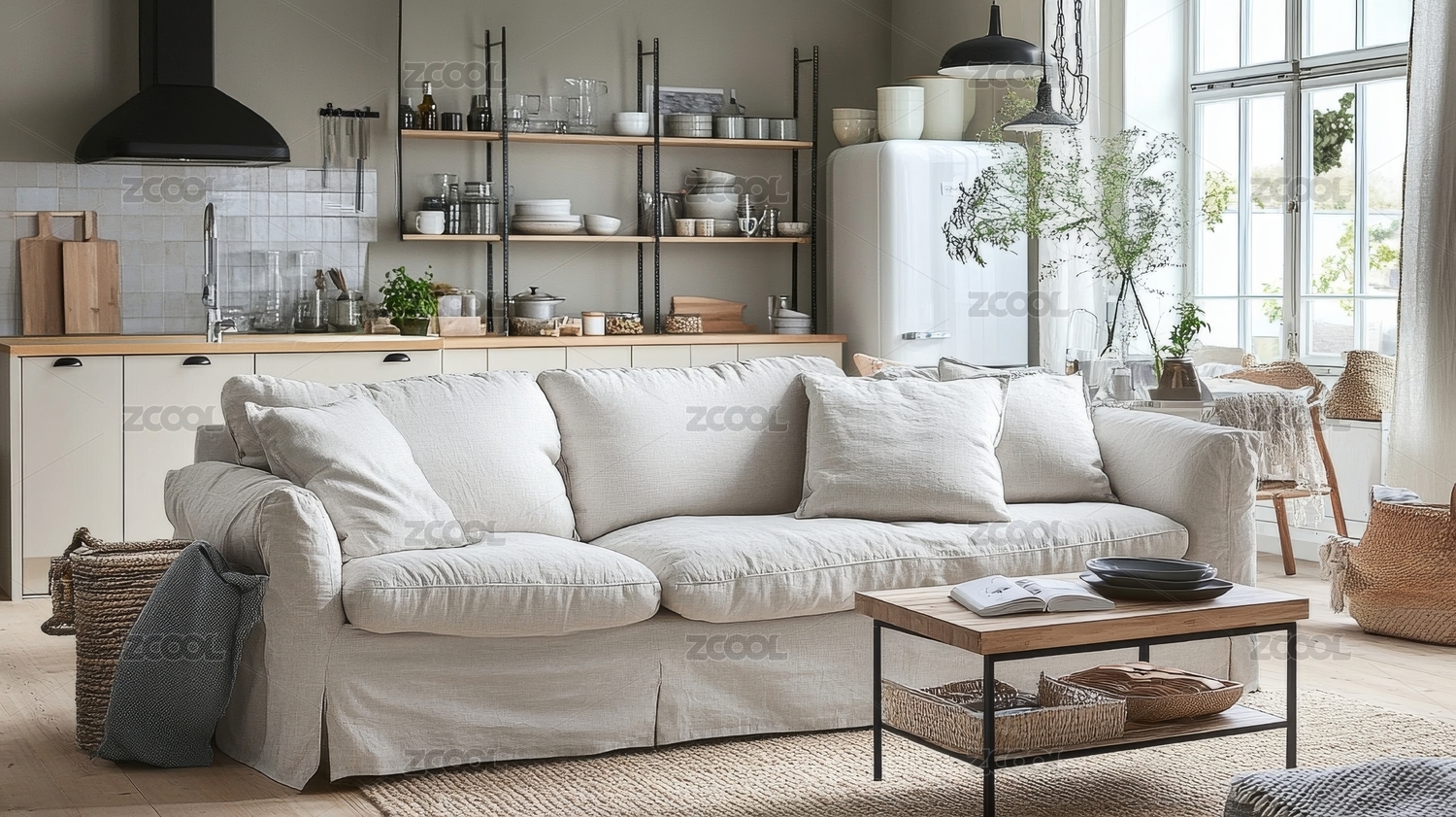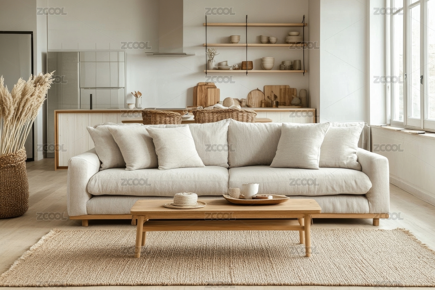 粗麻布家居沙发地毯等摆设的客厅空场景