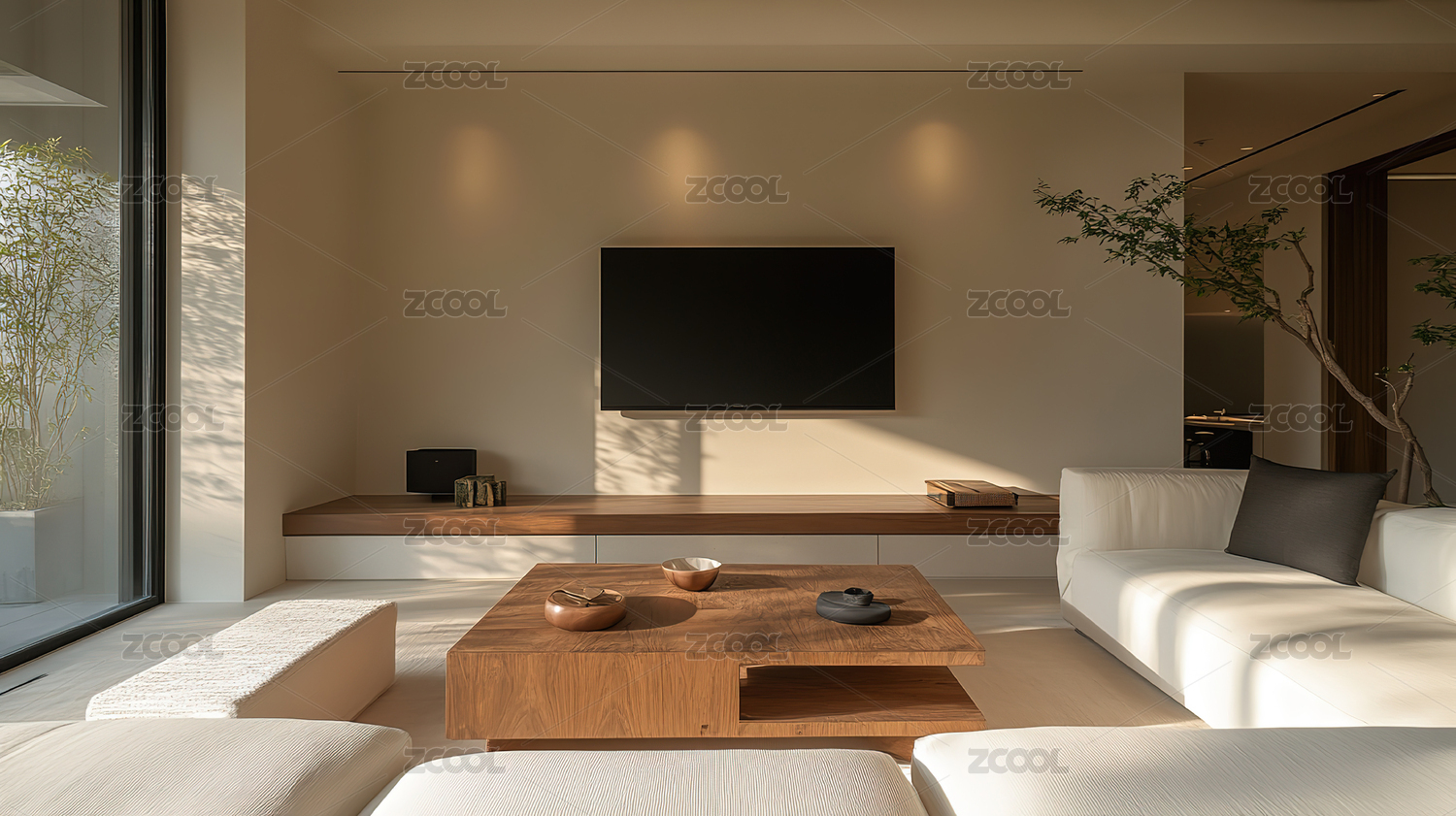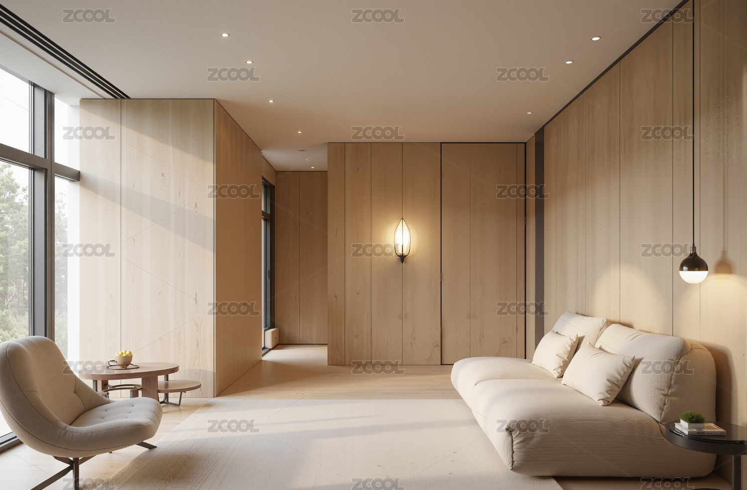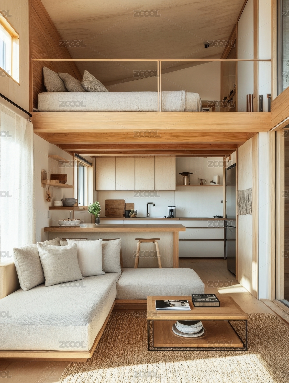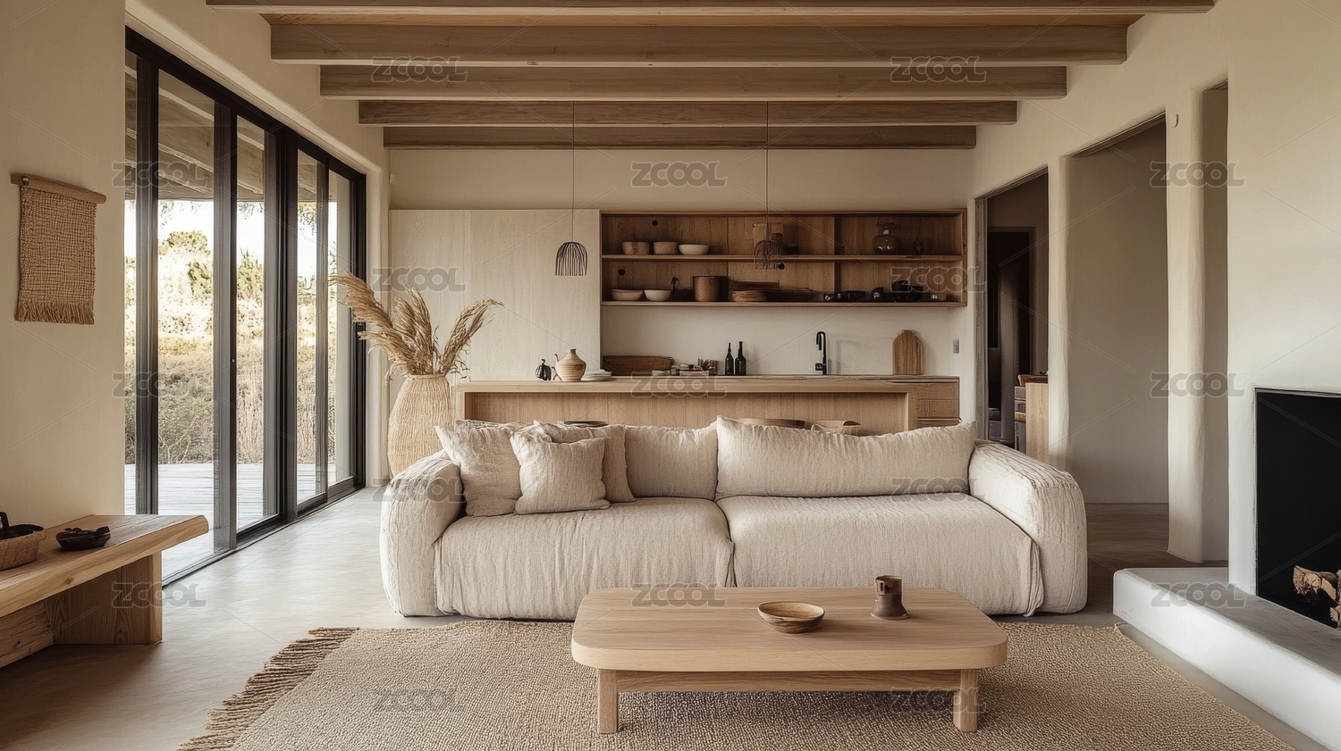 客厅,厨房,简约,现代,开放式,沙发,书架,木质,温馨,自然光