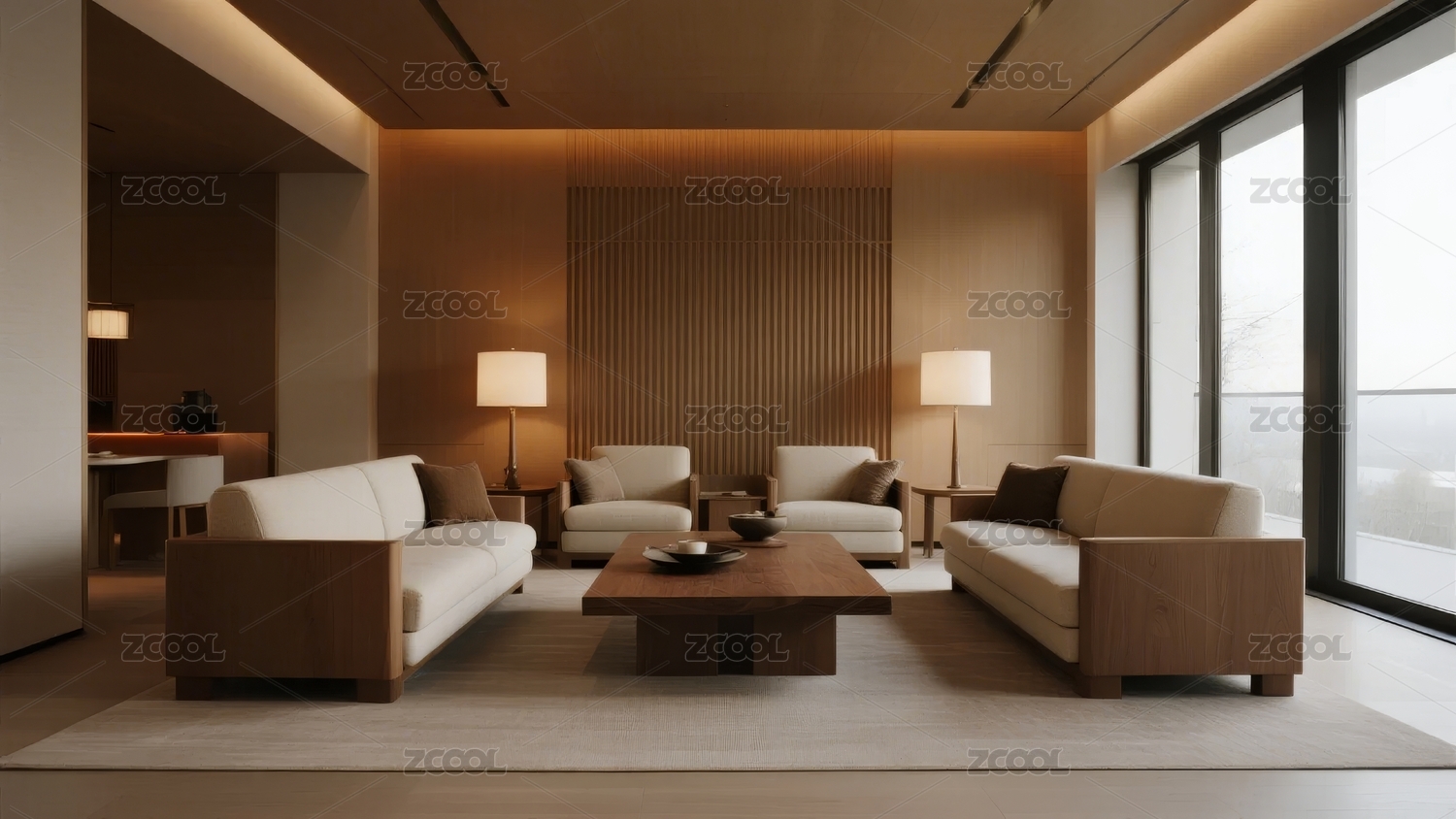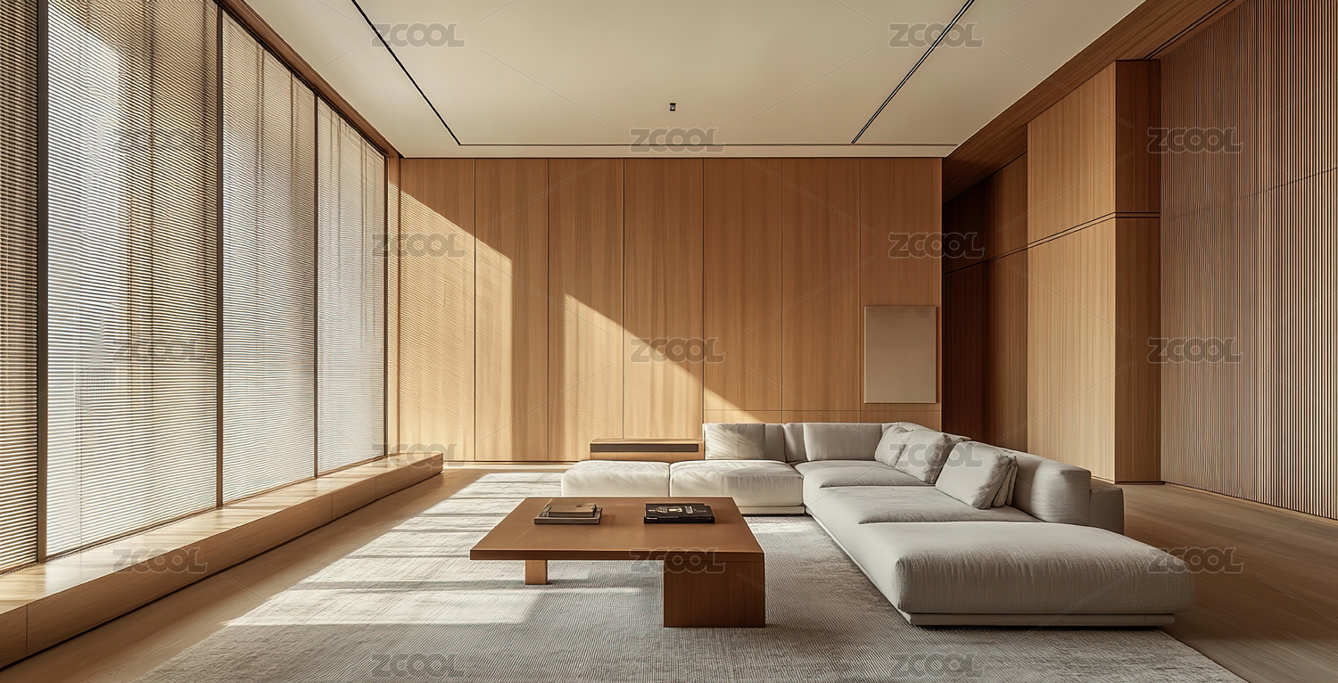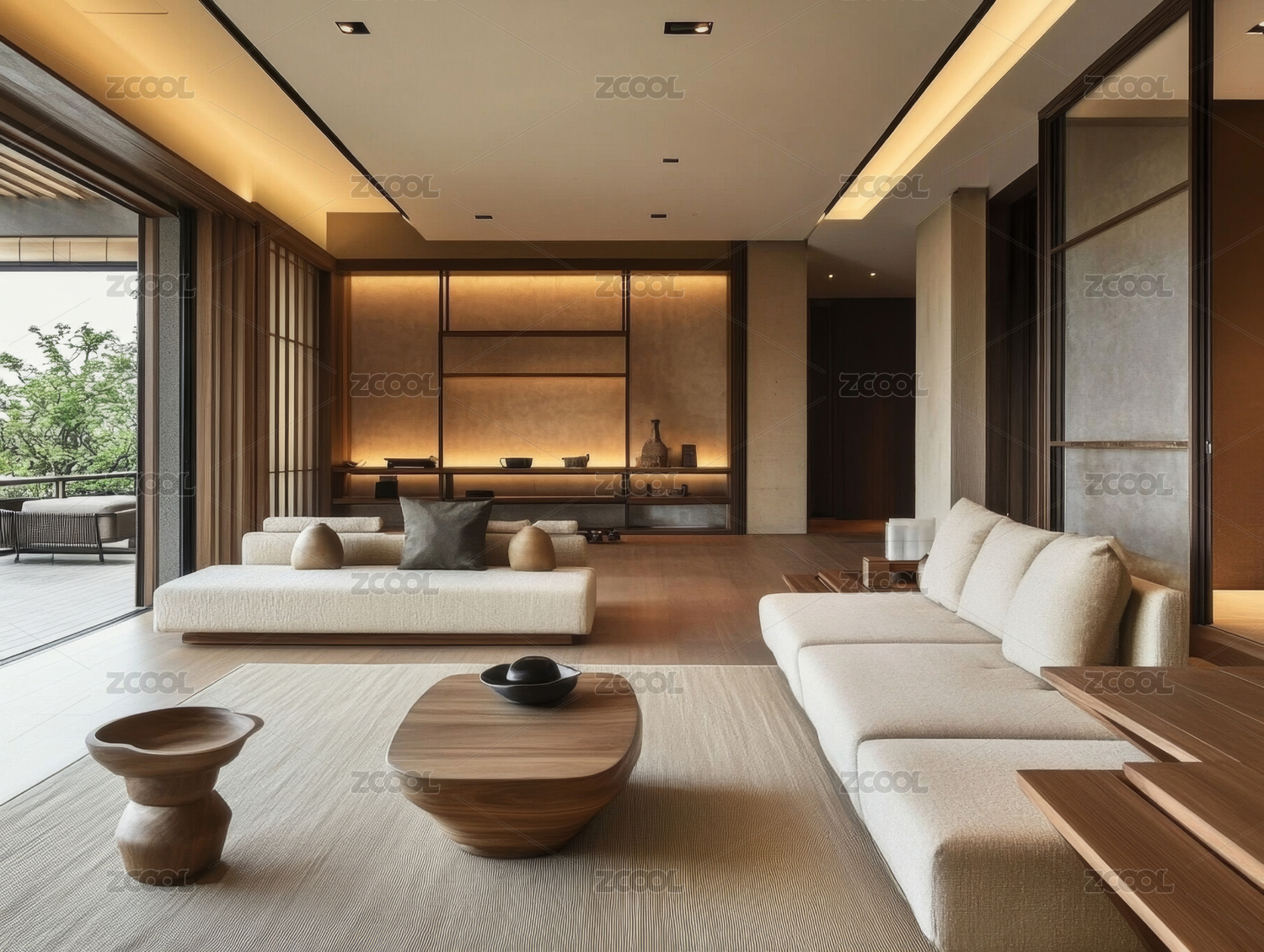 客厅,厨房,简约,现代,开放式,沙发,书架,木质,温馨,自然光