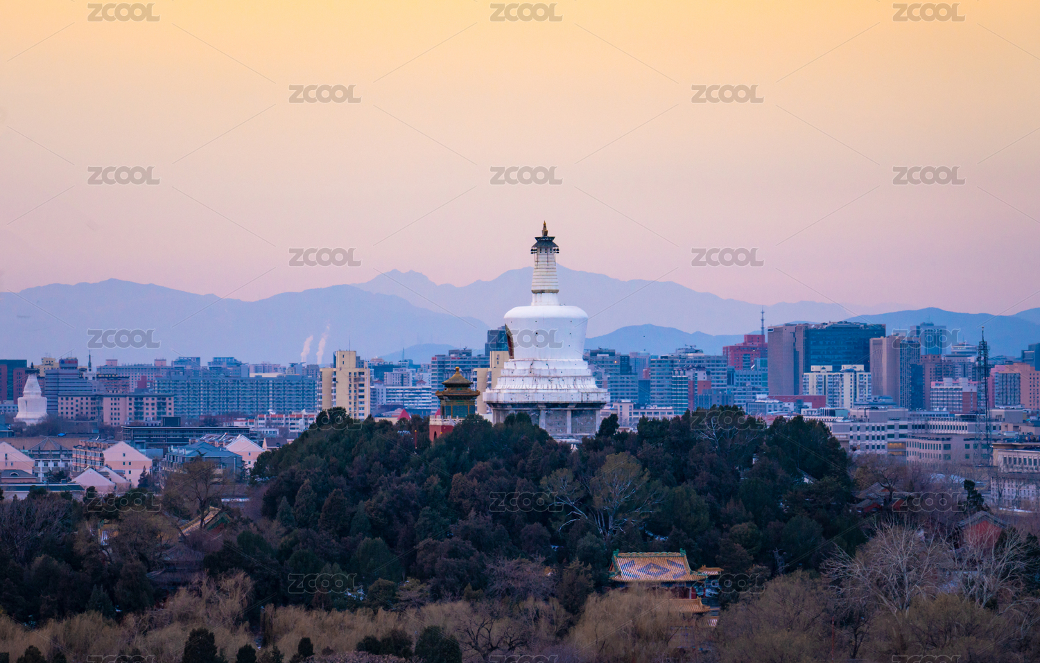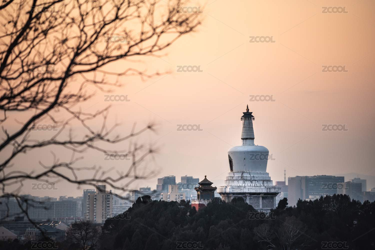 黄昏日暮下的北京北海公园白塔