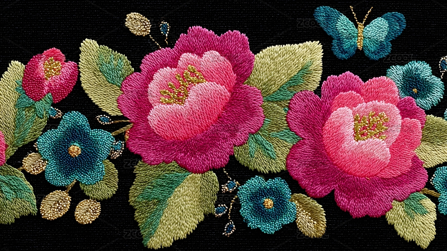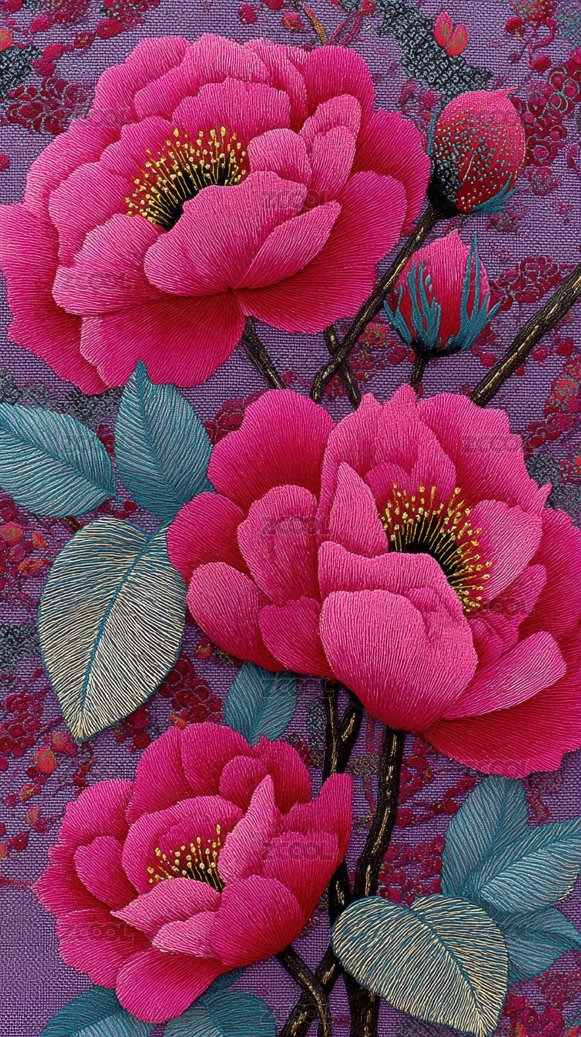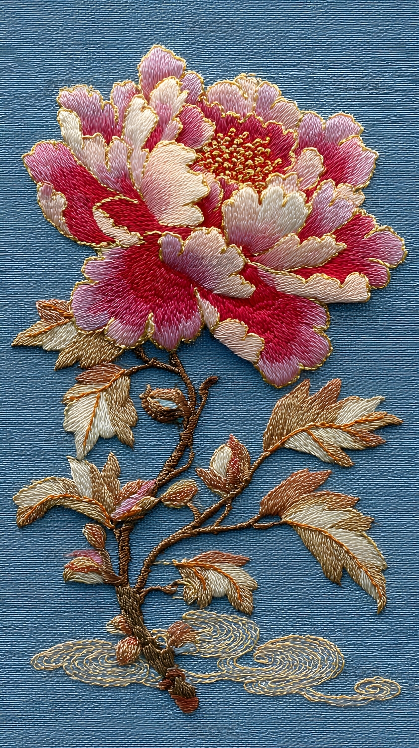 粉色牡丹刺绣绽放蓝色底色上精致典雅