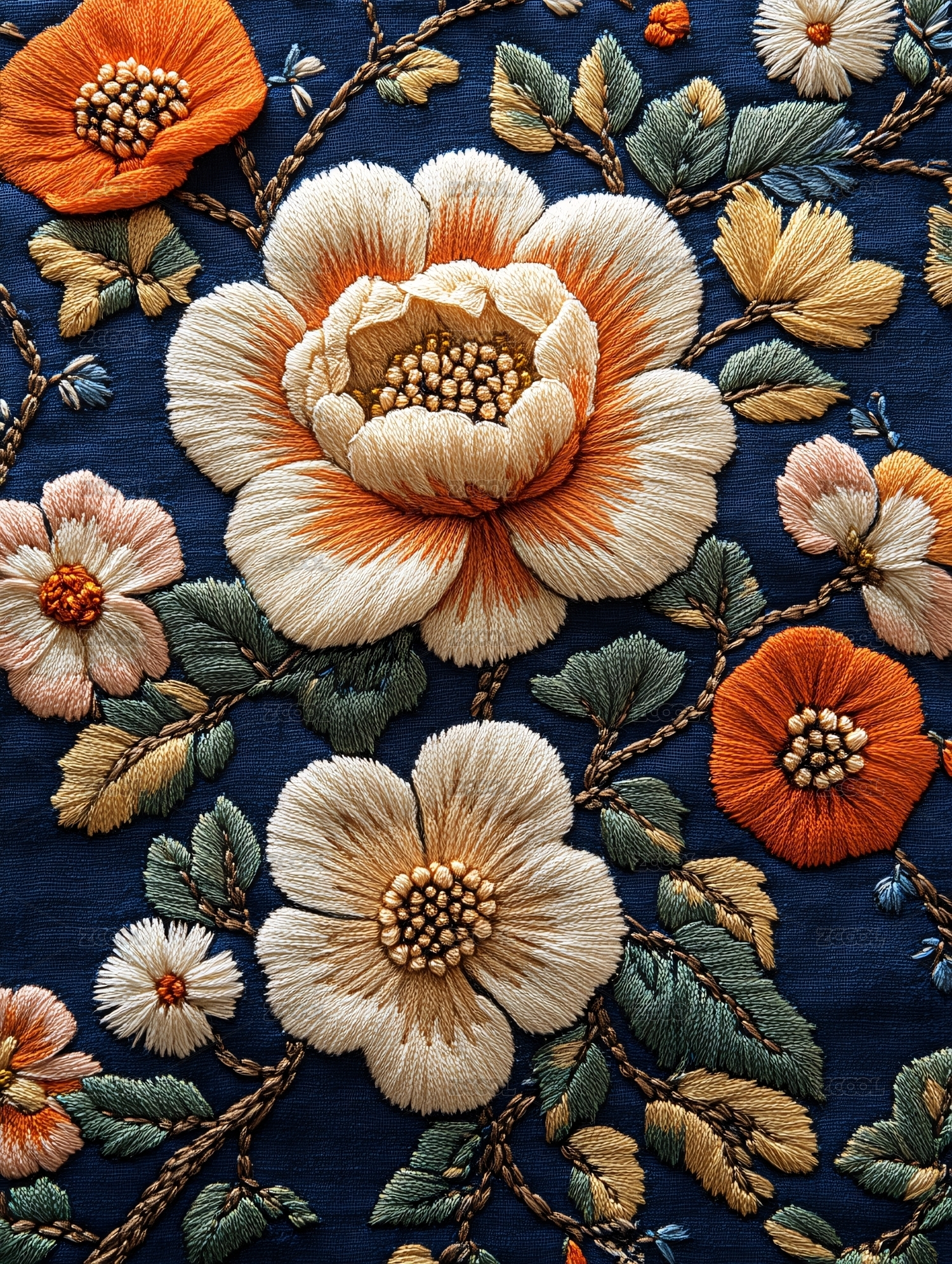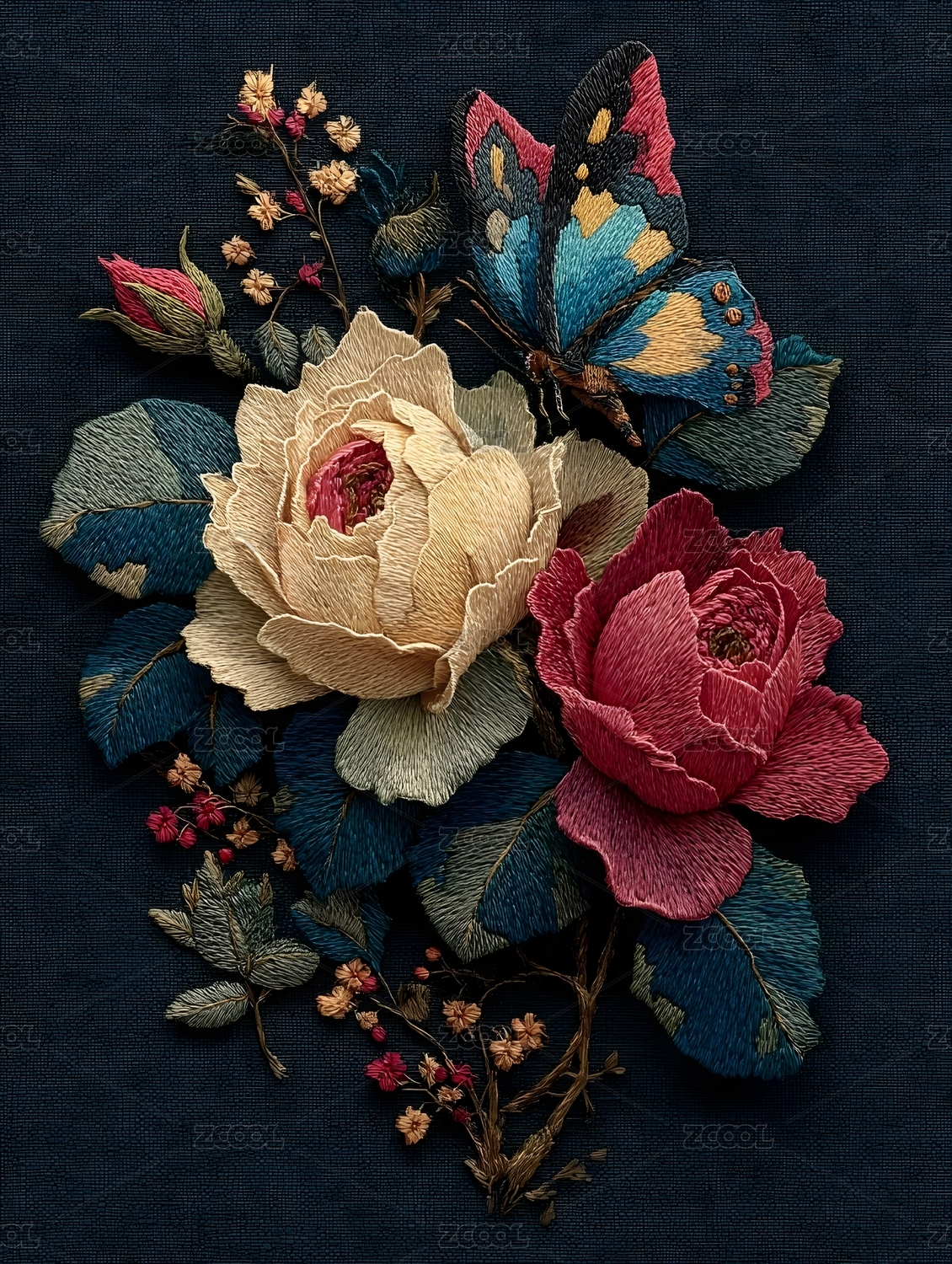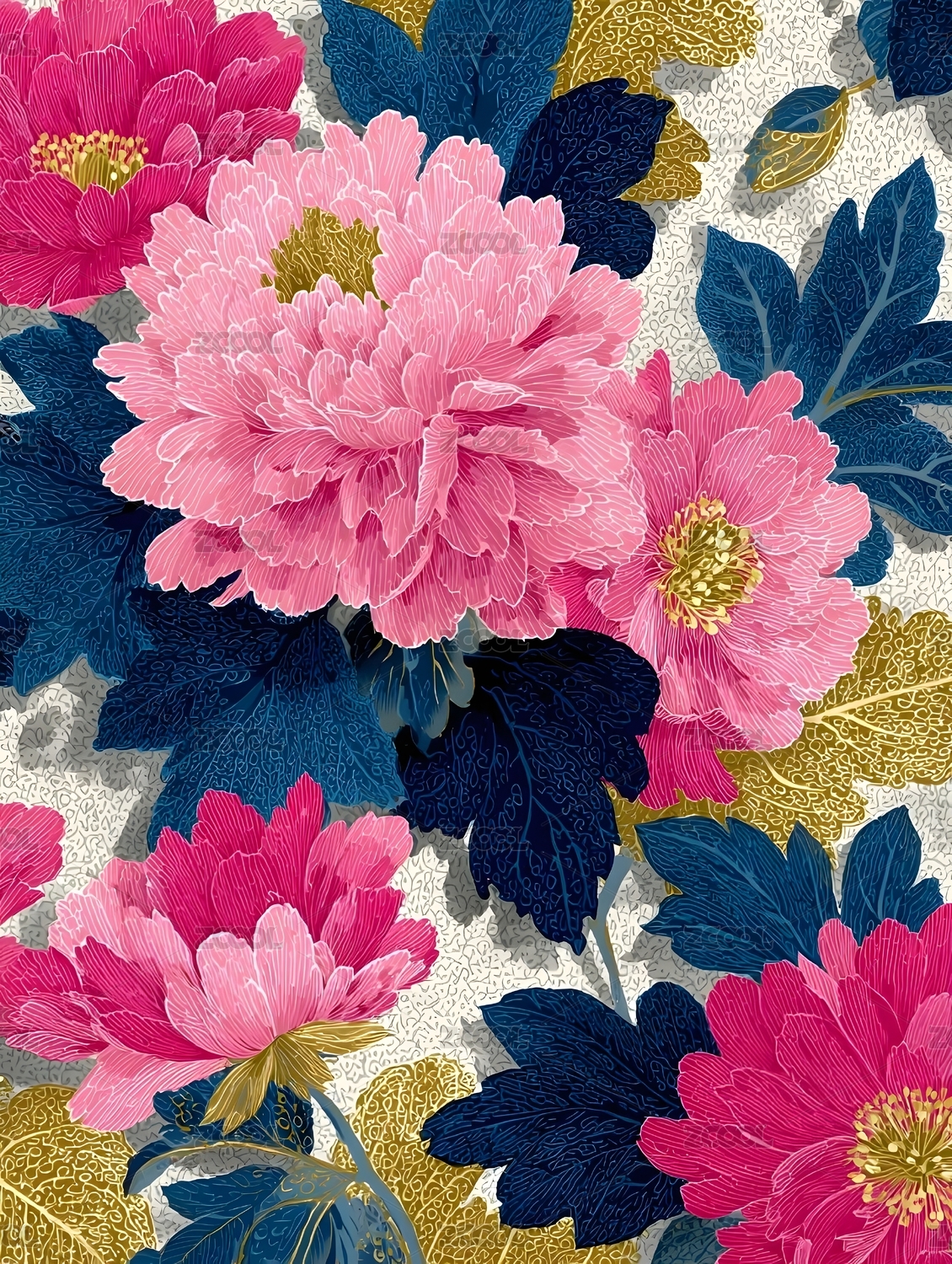 粉色牡丹刺绣绽放蓝色底色上精致典雅