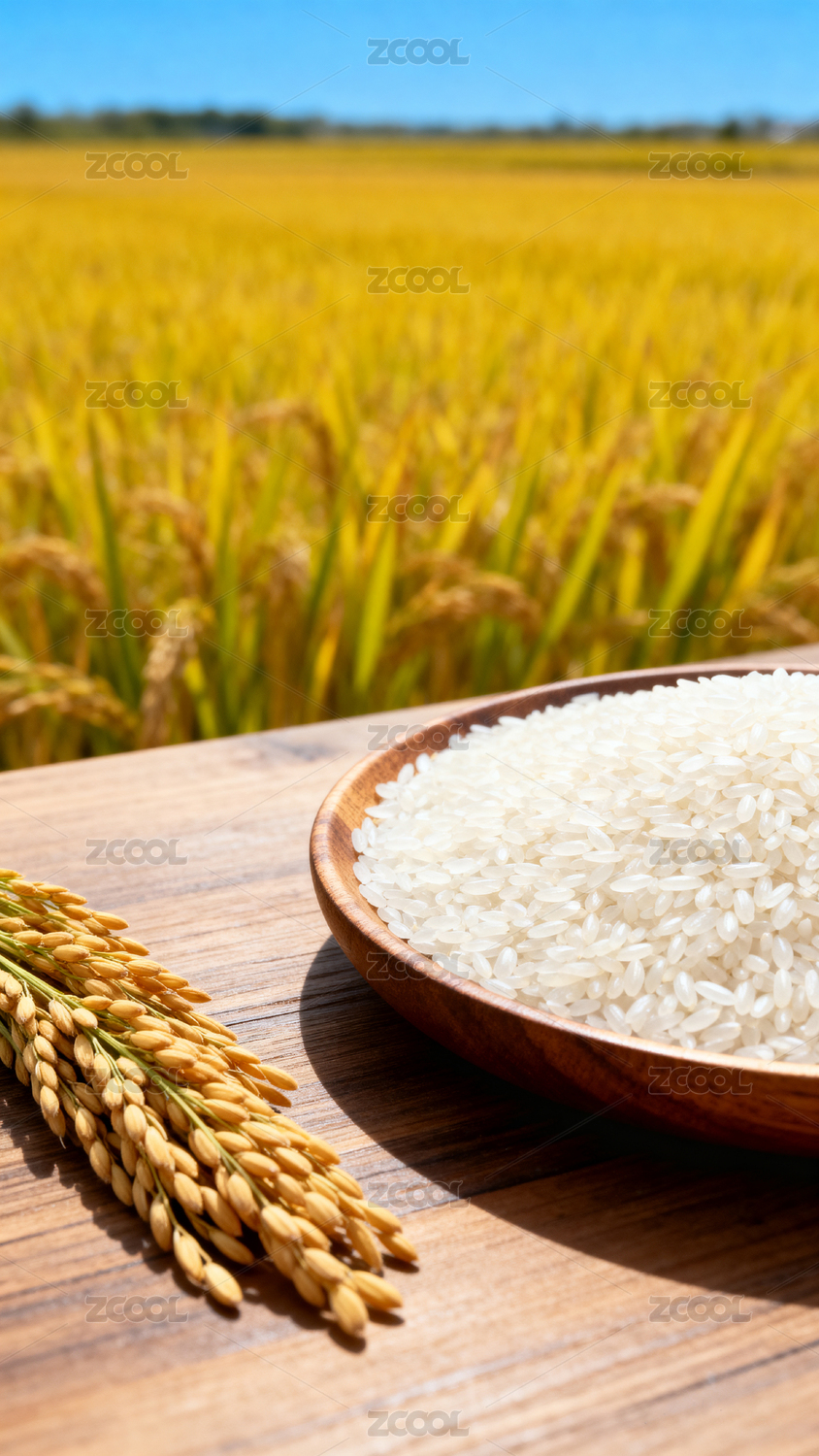 大量的白色颗粒大米在桌上摆放着金黄色作物
