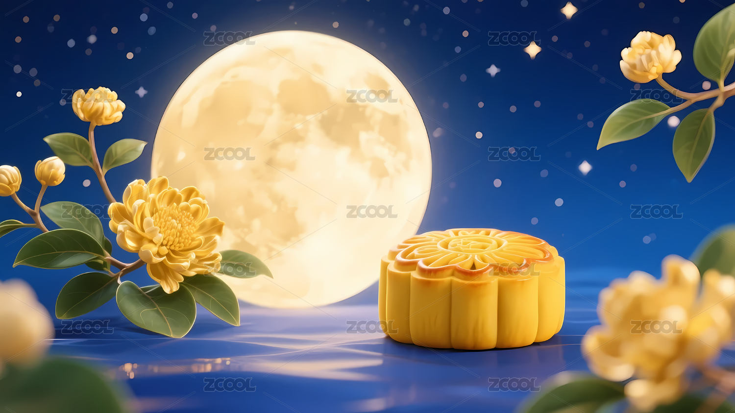 中秋节月亮下的月饼和玉兔插画背景壁纸