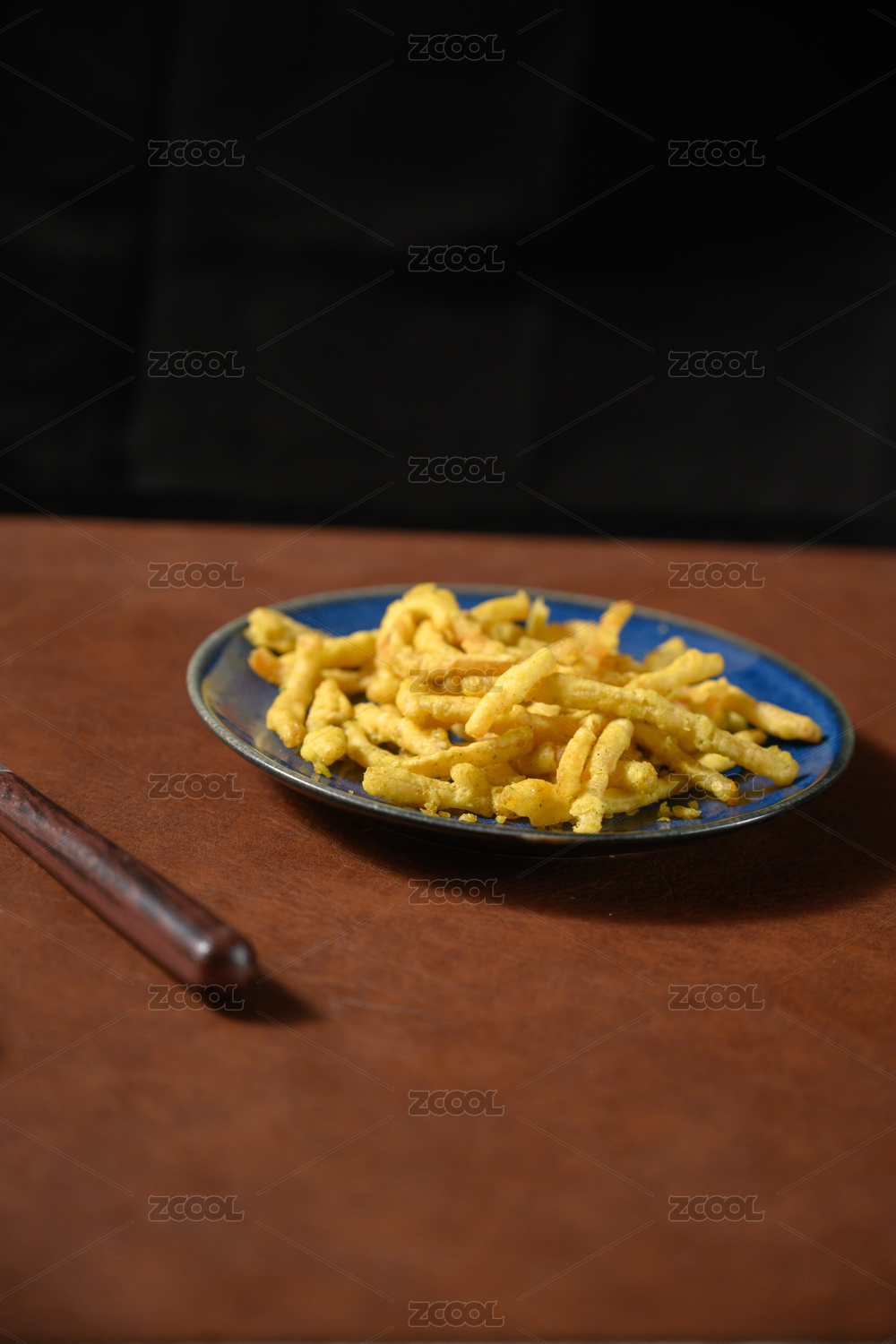 桌面上的盘子里的美味可口的油炸鱿鱼丝