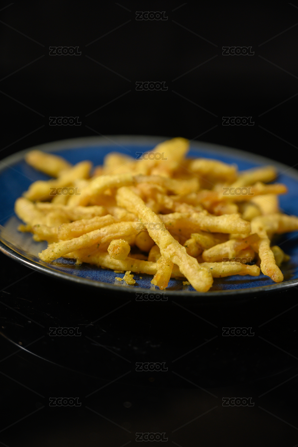 桌面上的盘子里的美味可口的油炸鱿鱼丝