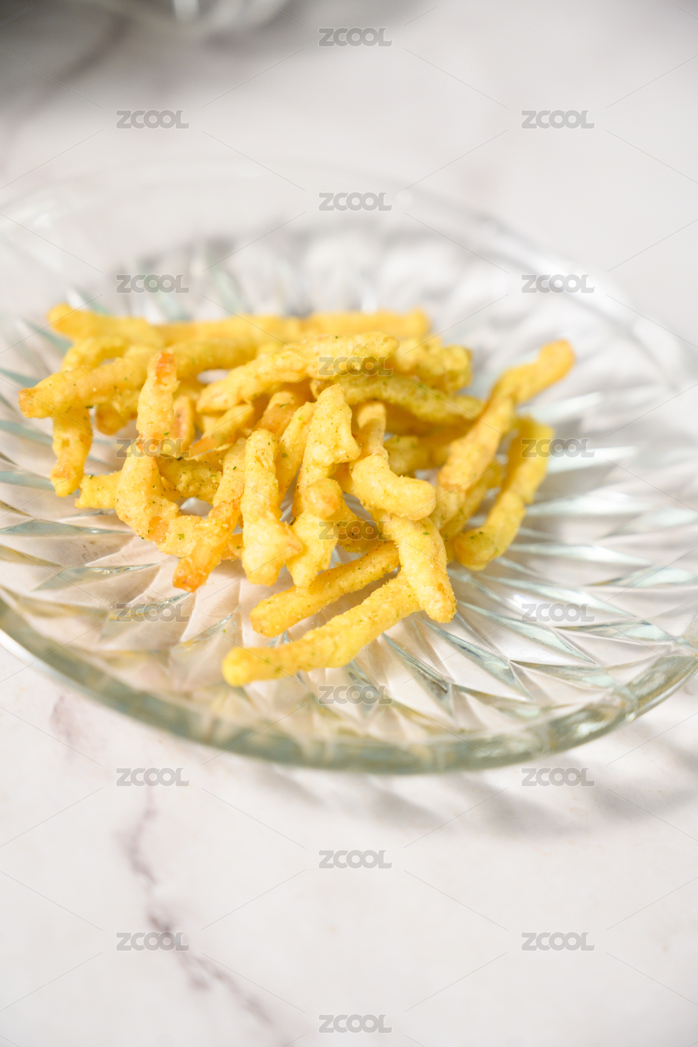 桌面上的盘子里的美味可口的油炸鱿鱼丝
