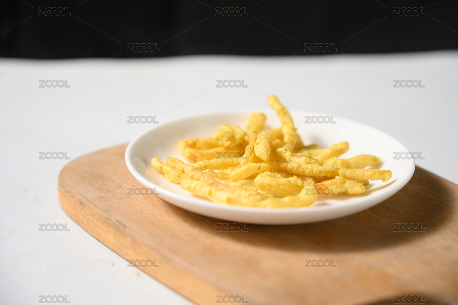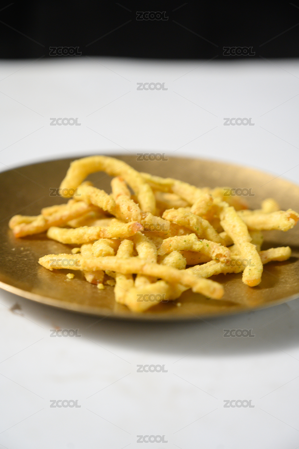 桌面上的盘子里的美味可口的油炸鱿鱼丝