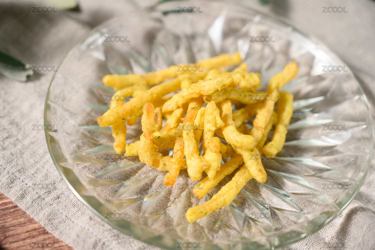 桌面上的盘子里的美味可口的油炸鱿鱼丝