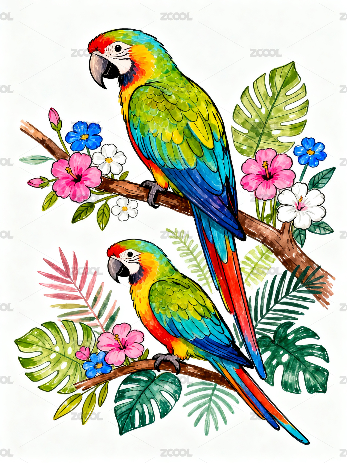 热带植物中的彩色鹦鹉和巨嘴鸟