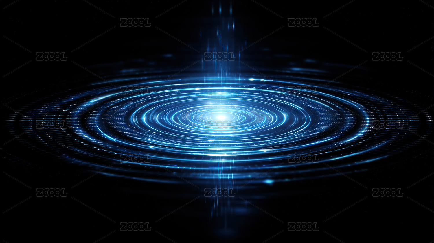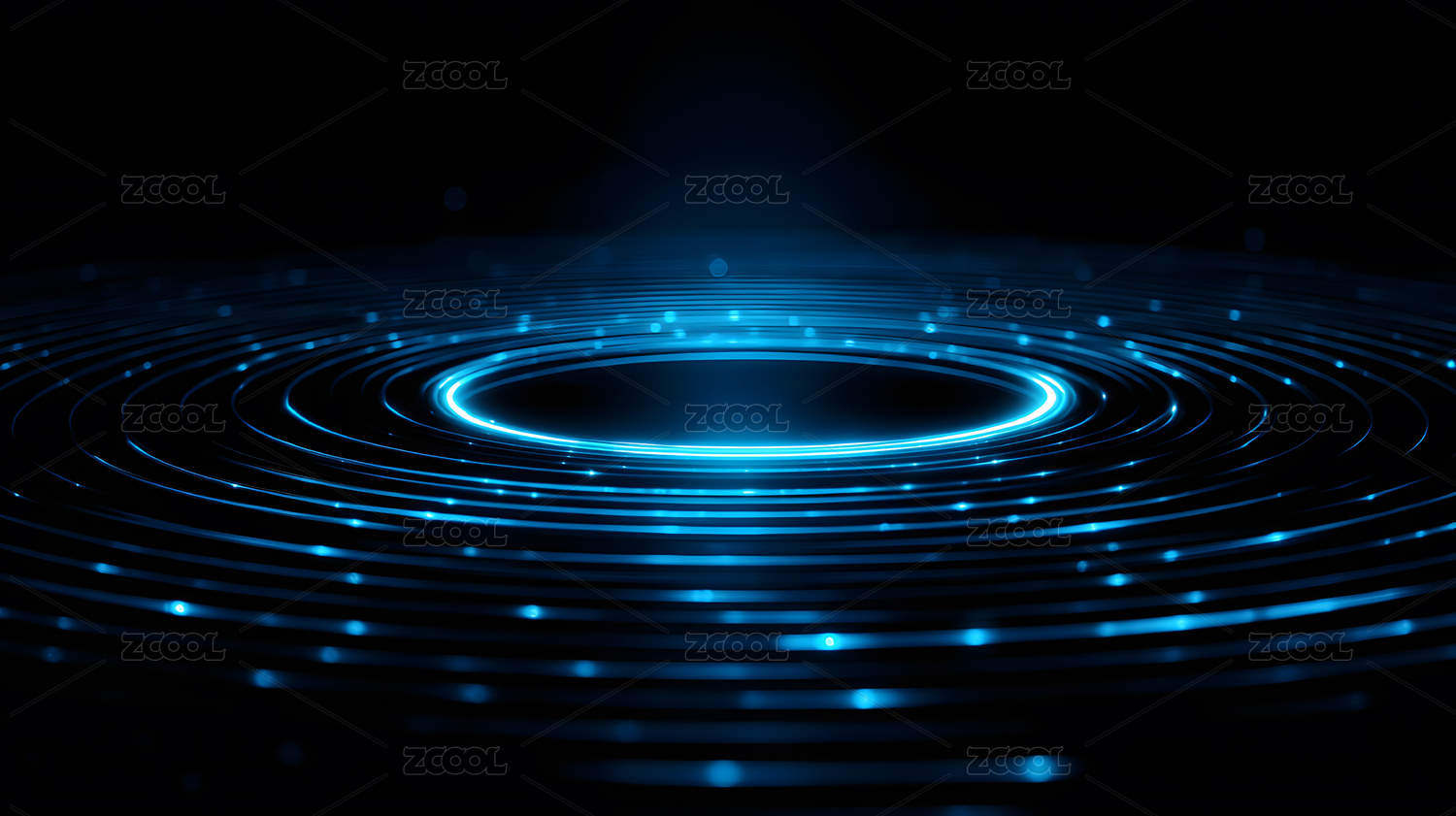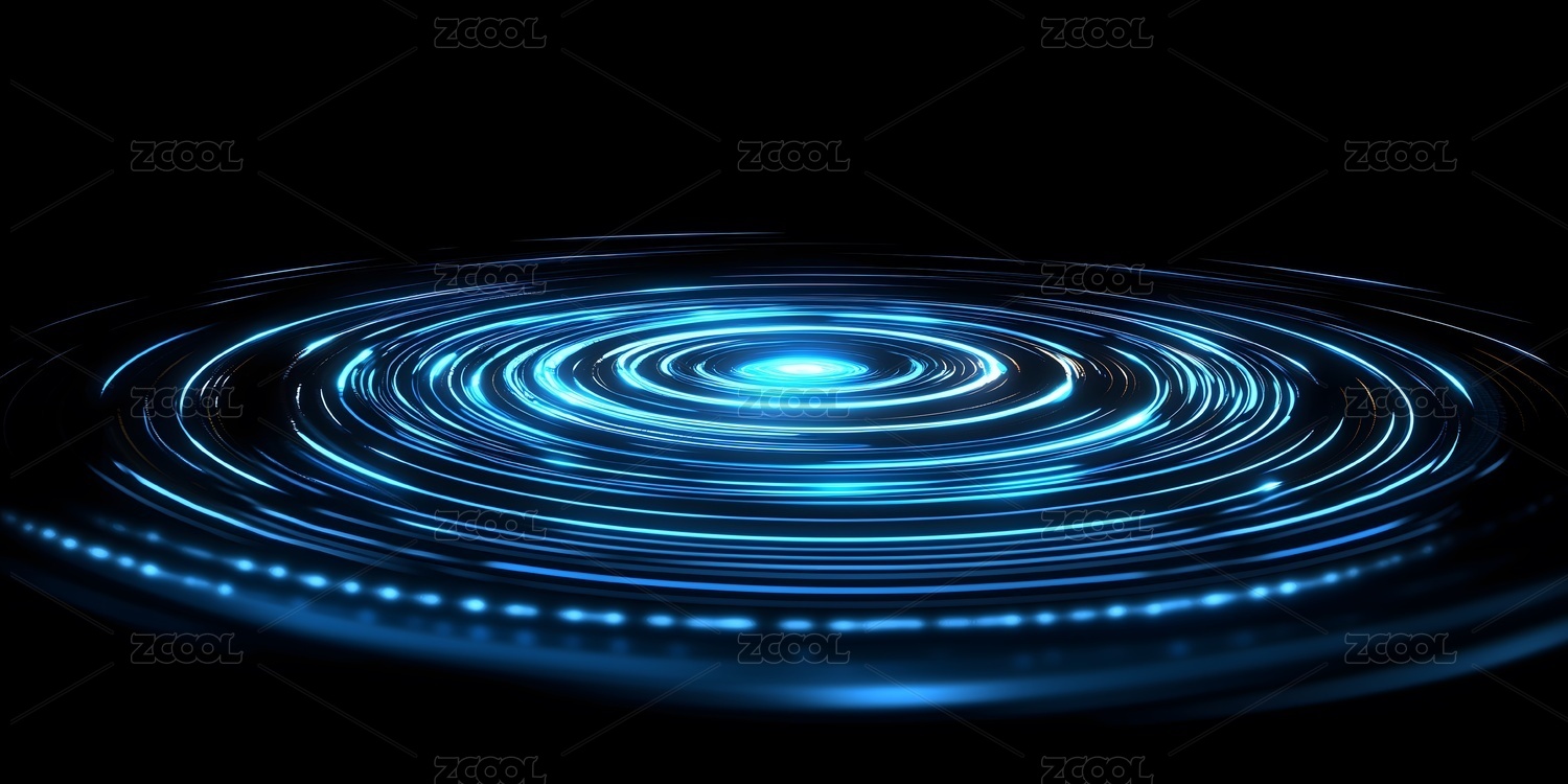 科技感,未来感,蓝色光圈,黑暗背景,光线扩散,抽象图案,视觉效果,光影艺术,环形光带,神秘氛围