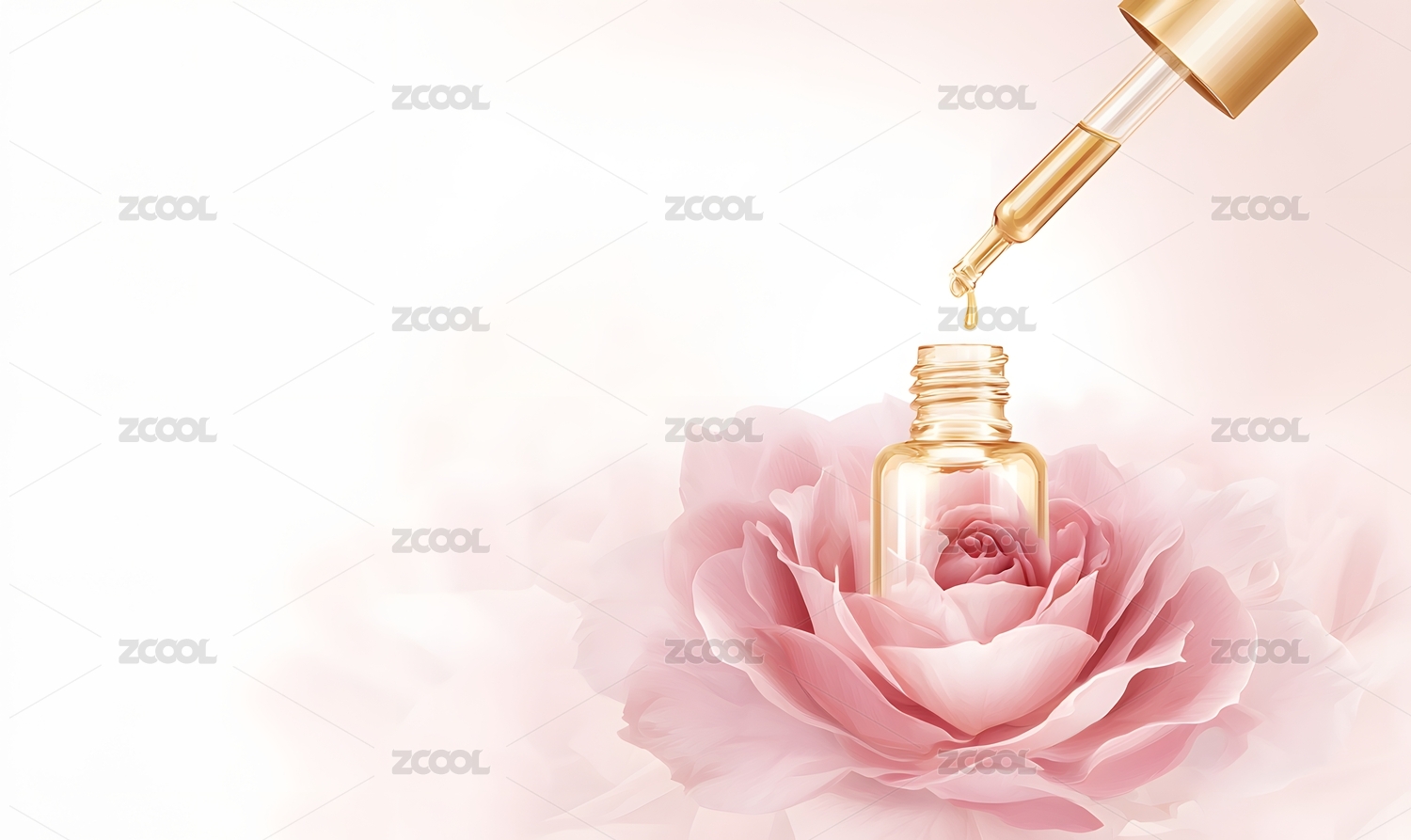 粉色玻璃瓶装精华液置于玫瑰花旁