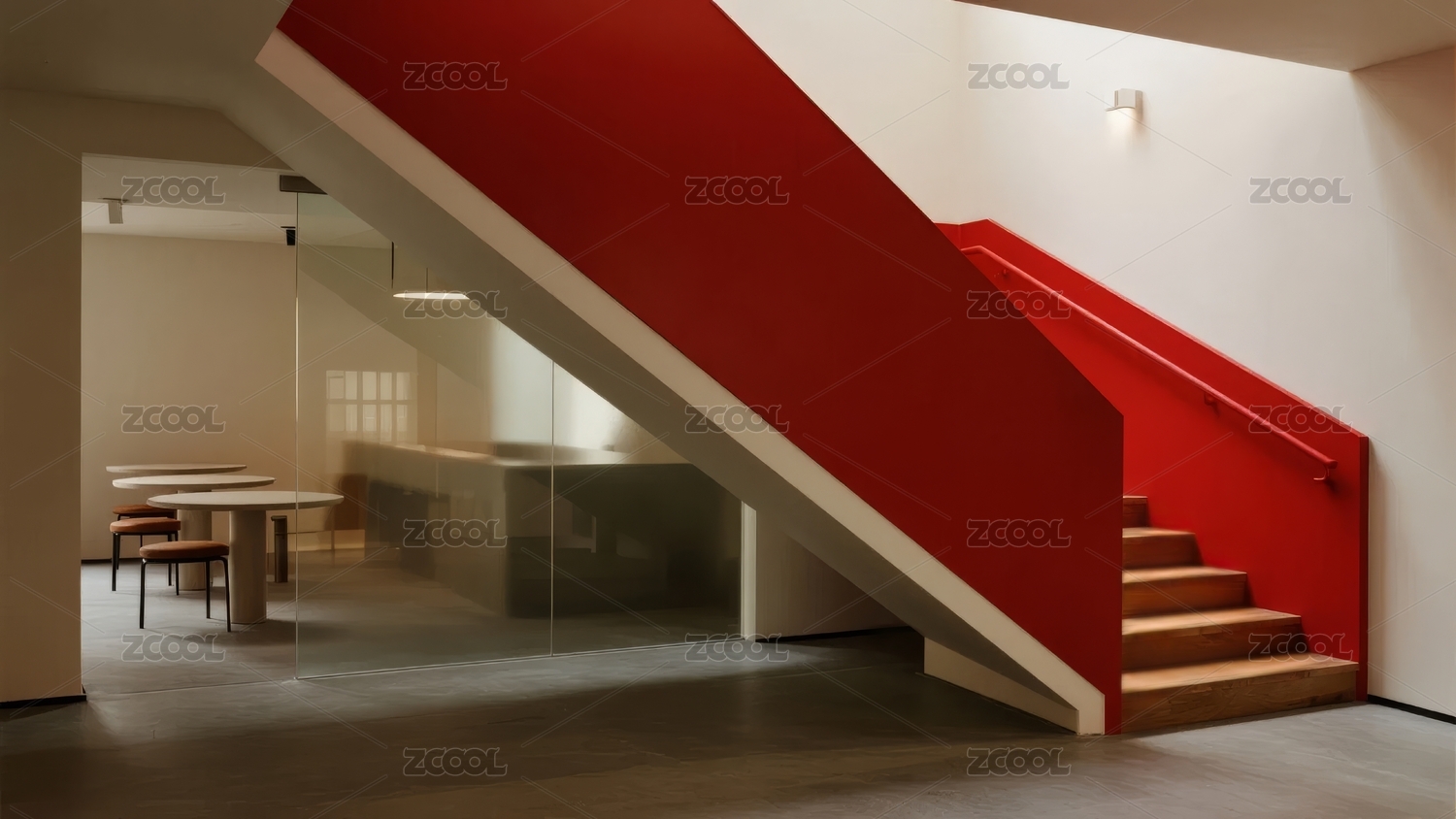 红色楼梯的现代室内空间