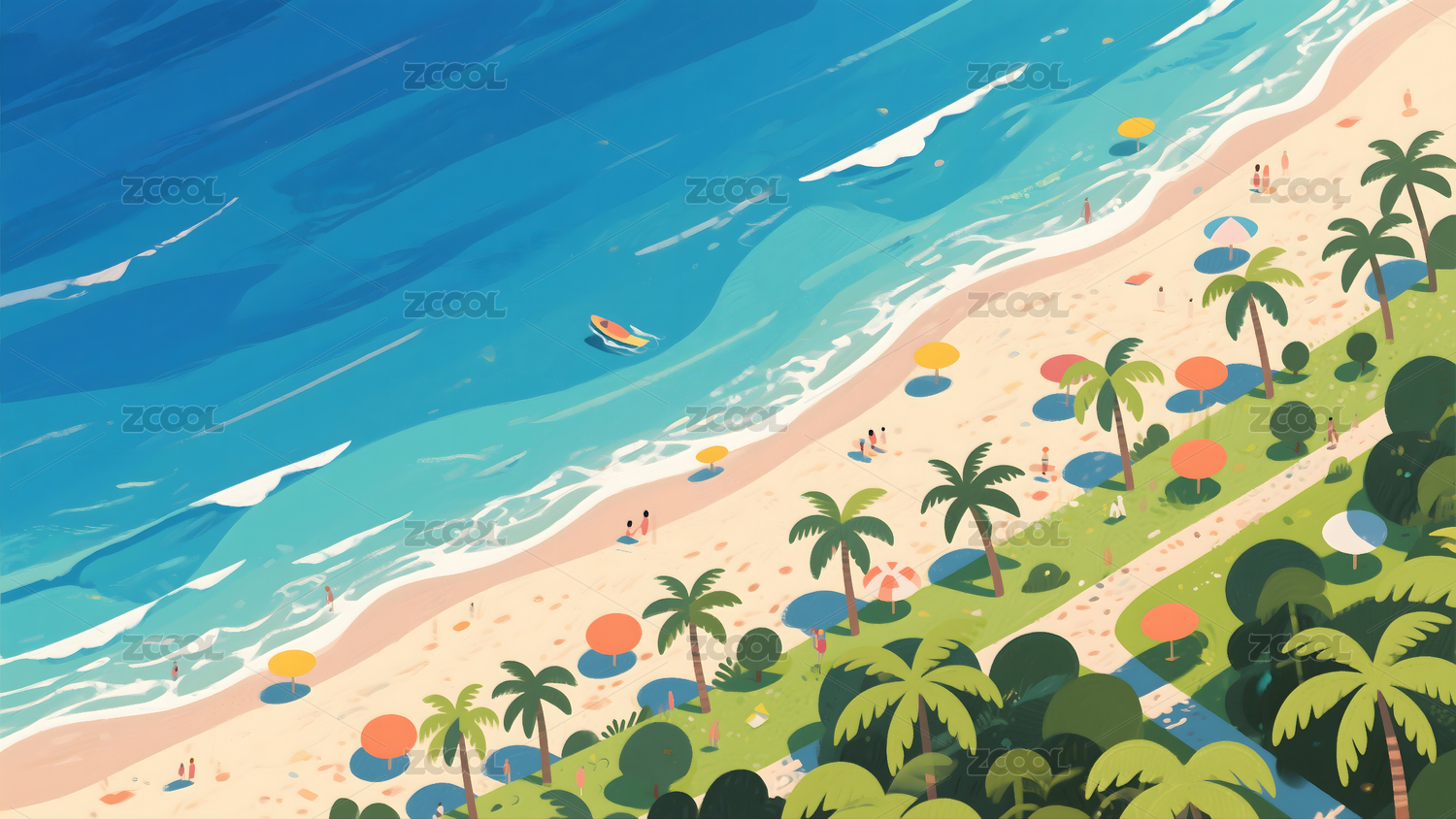 一个繁荣的海滨城市在夏天的景观插图,漫画