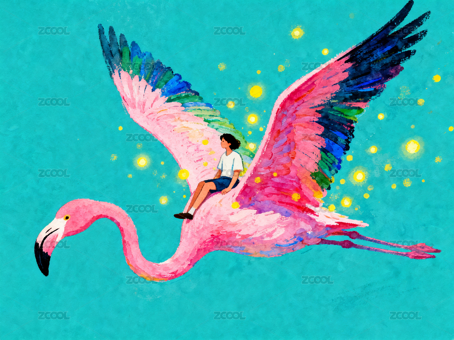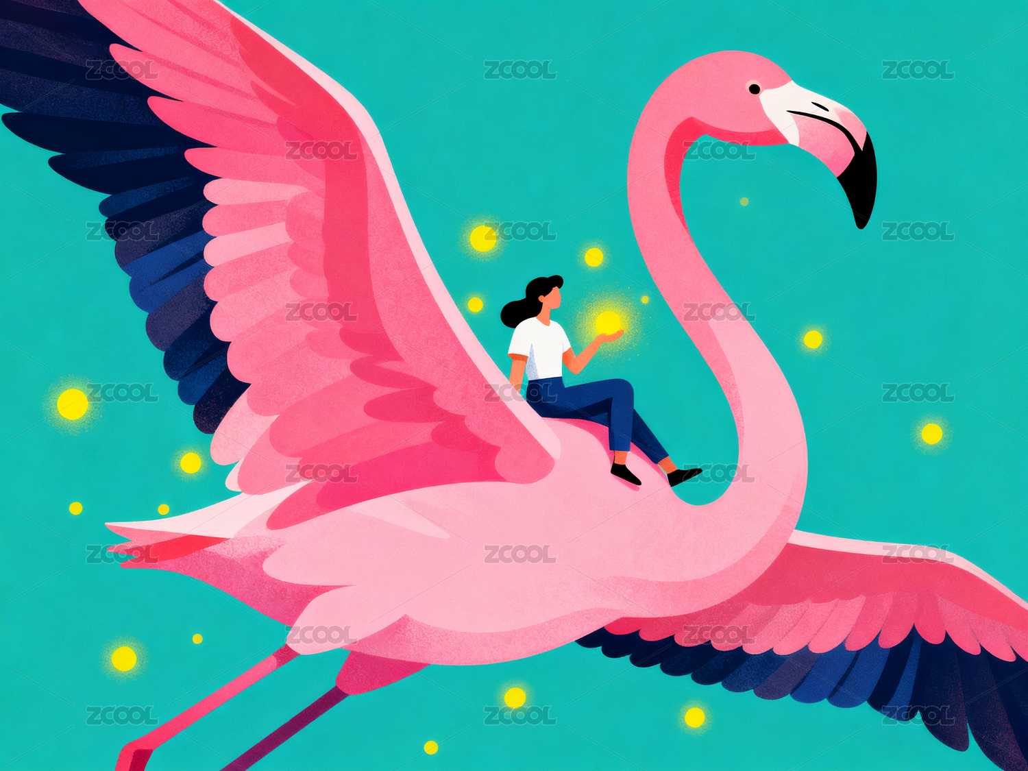 女孩骑着巨大粉色火烈鸟飞行