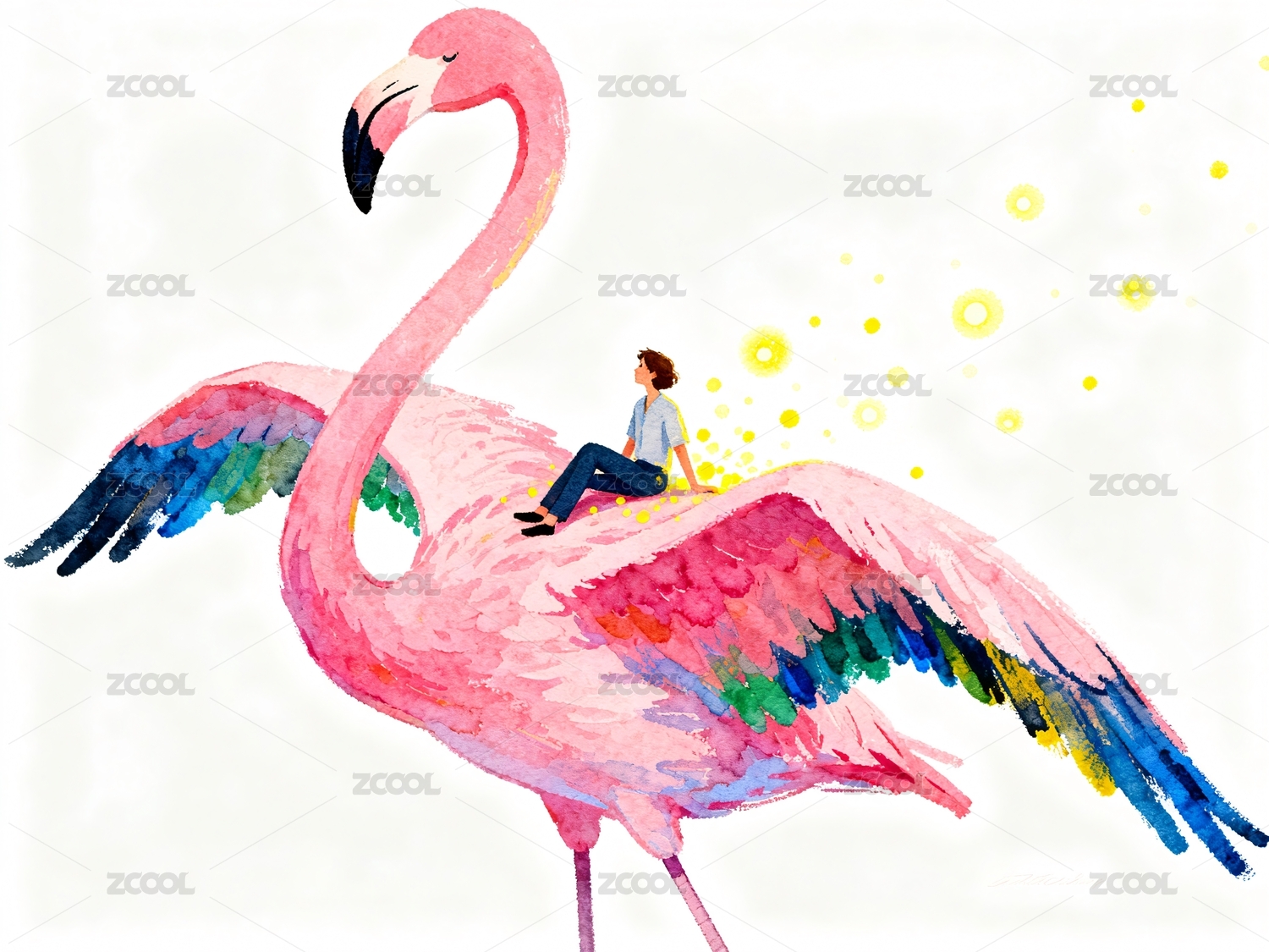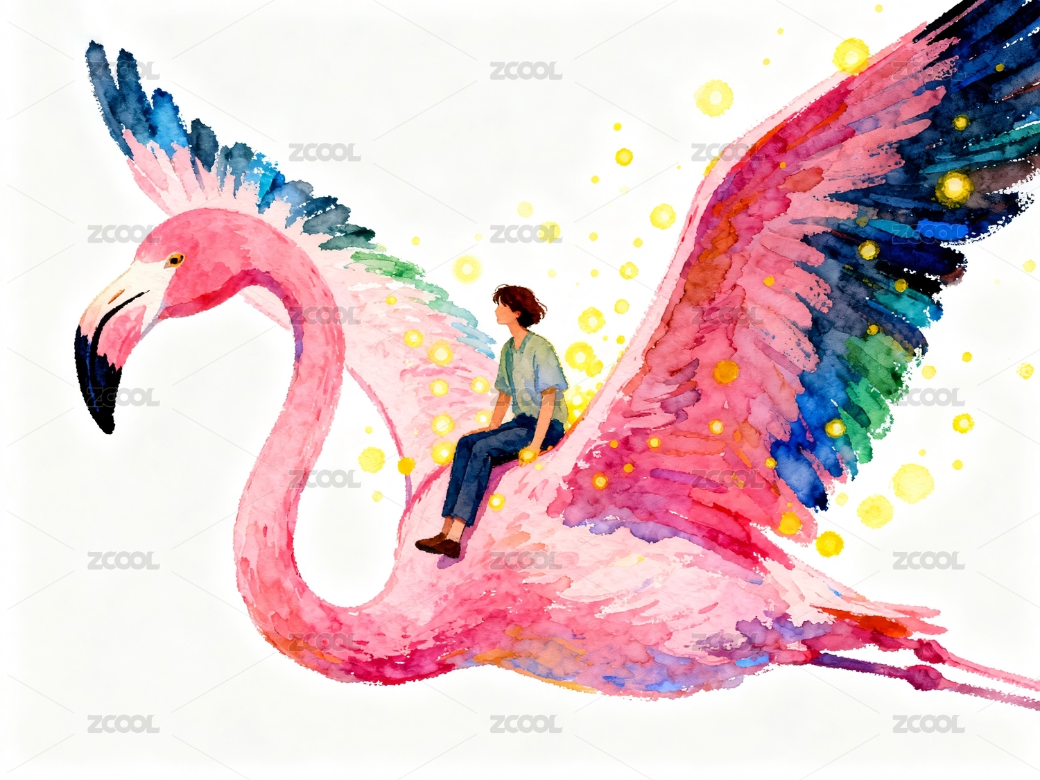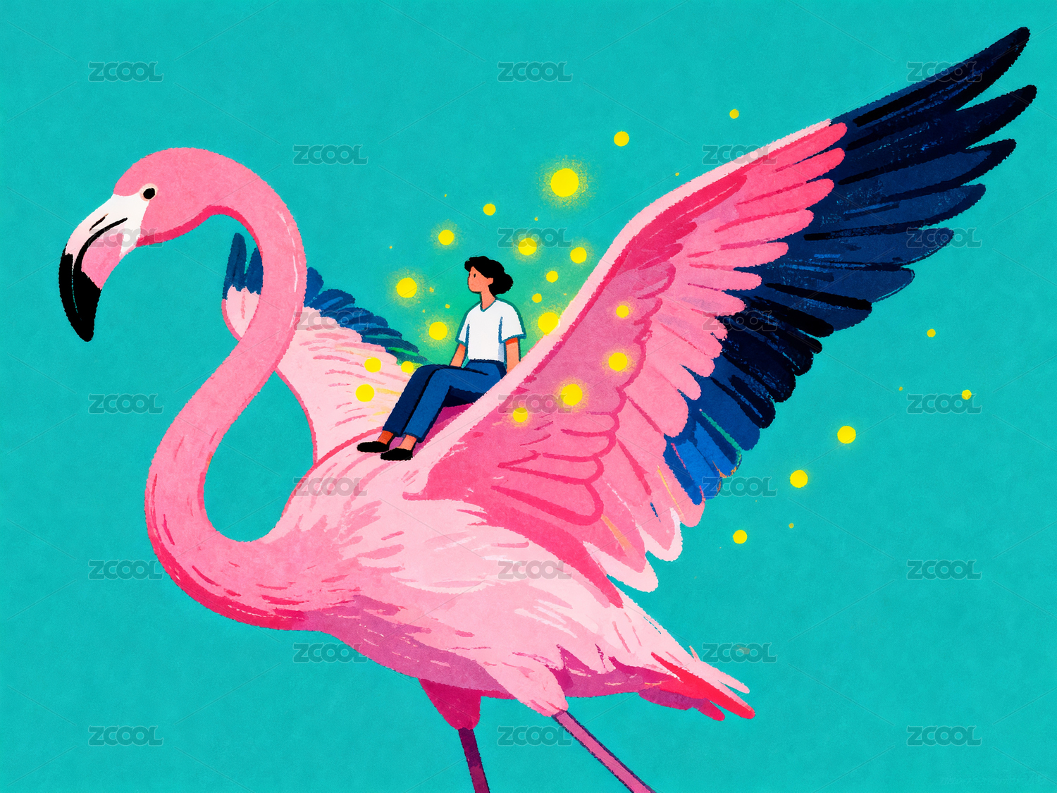 人骑巨型粉色火烈鸟飞翔