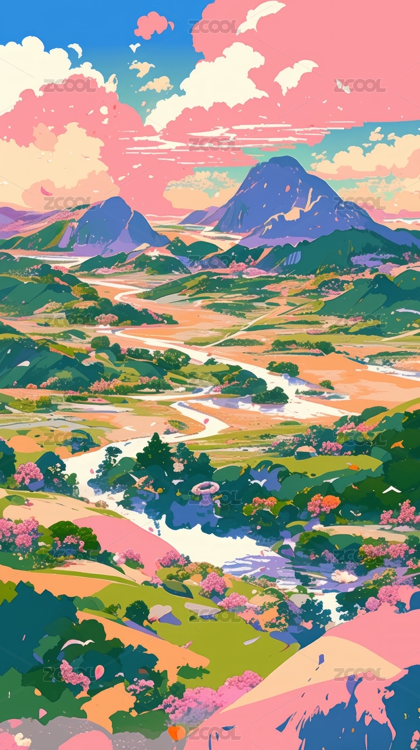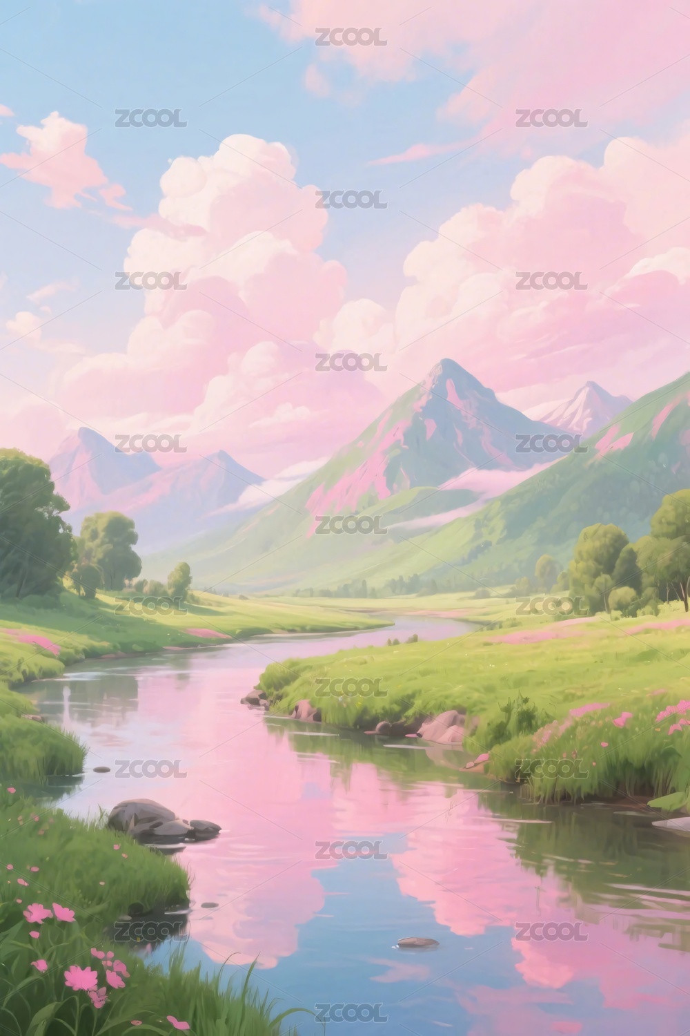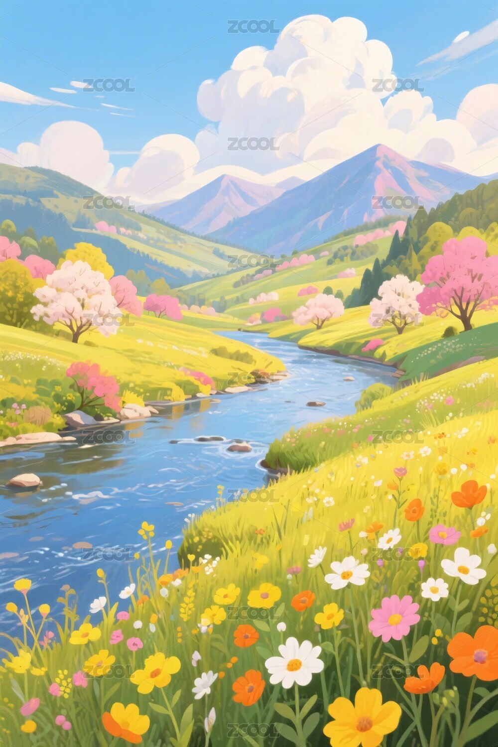 河流,山脉,草地,天空,云朵,山水,田园,自然,风景,水彩