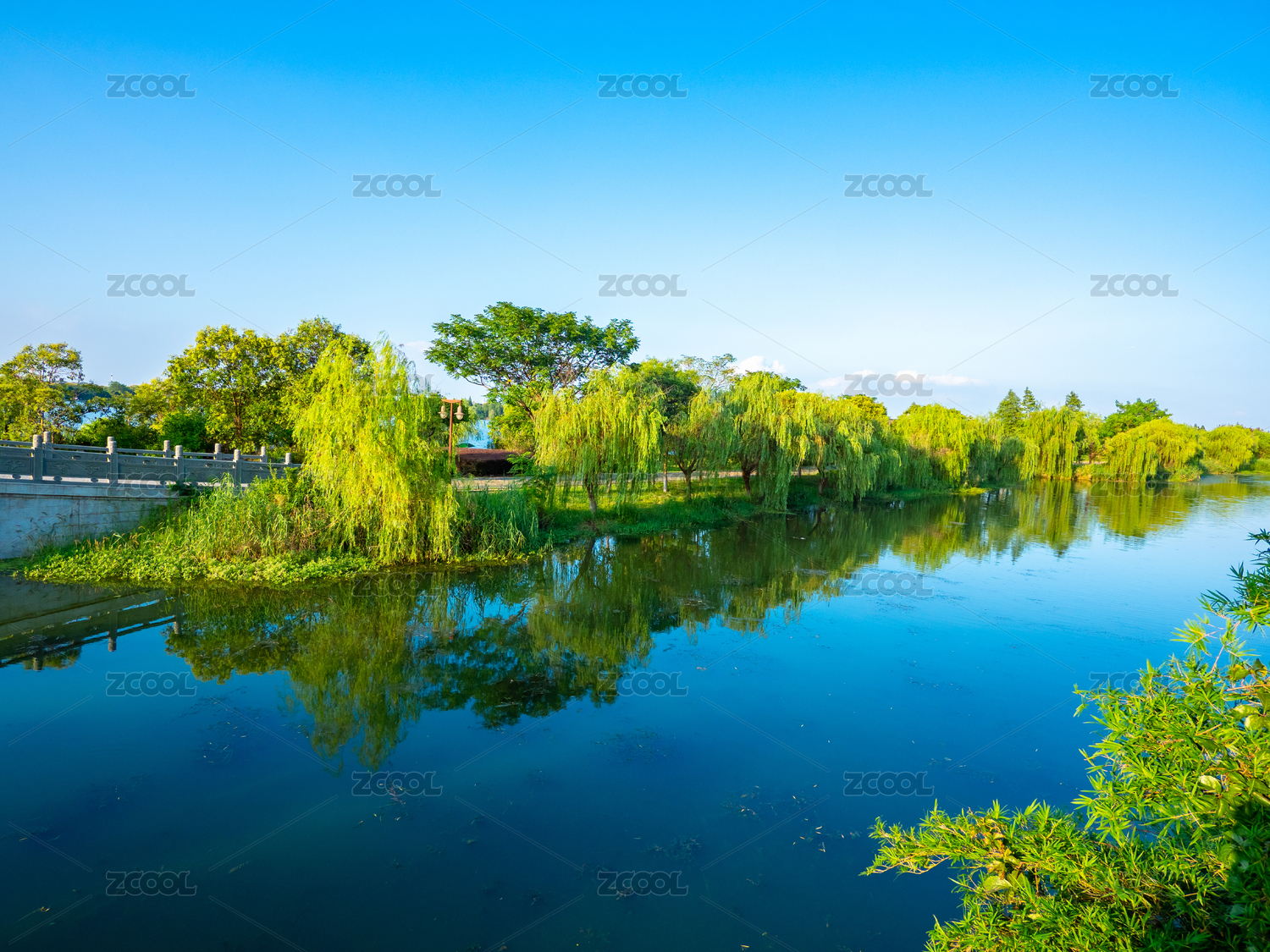 生态环境保护,晴朗天空下的湖水绿树